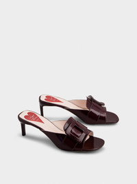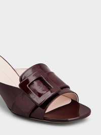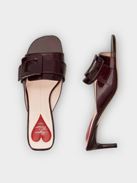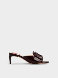 Crafted in patent leather, the Viv' Canard Mules are a mix of iconic elements. Characterized by a rounded toe and covered buckle, they feature a lacquered kitten heel with Roger Vivier logo and the emblematic heart on the insole. The final touch to a metropolitan woman's allure. Description & details Patent calfskin leather Covered buckle Leather insole with heart-shaped insert Leather outer sole Lacquered kitten heel Heel height 2.2 ins Made in Italy Mod: RVW77842590TM6L822