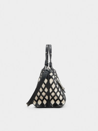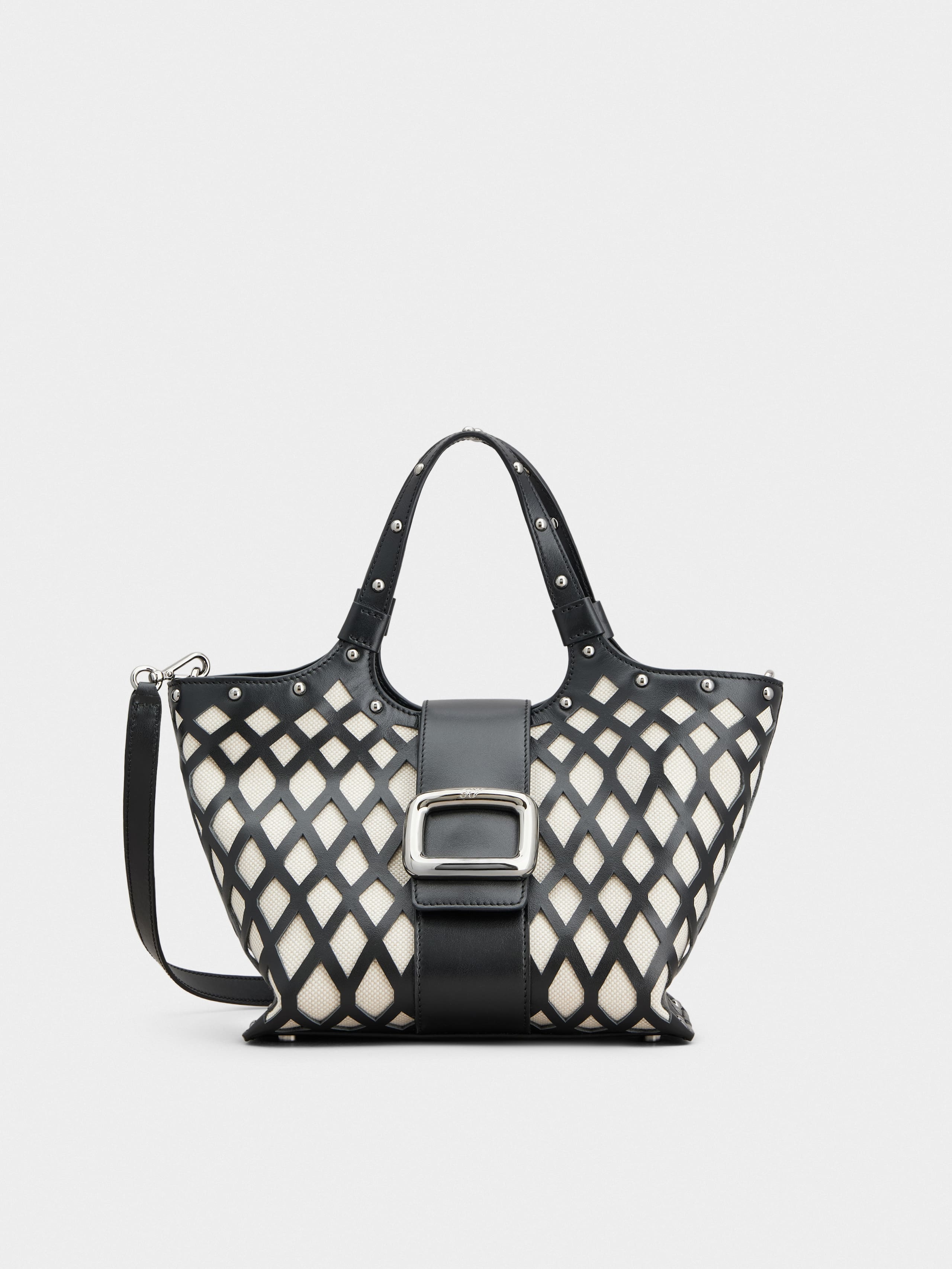 Characterized by the metal buckle with its distinctive rounded shape, the Viv' Choc shopping bag is here crafted in fabric and leather with perforated detailing. Featuring a practical and wide compartment, it comes with studded fixed handles and a removable shoulder strap for carrying it by hand, over the shoulder or crossbody. Elegant and functional at once, it is the perfect ally of the metropolitan Vivier woman. Description & details Dimensions: L 12.2 x H 7.1 x D 4.5 ins Calfskin leather and fabric Fixed handles Adjustable and removable shoulder strap Metal buckle Strap and magnet closure Adjustable compartment with central strap Internal pocket Branded metal feet Maintenance and care cards included Made in Italy Mod: RBWAOGAF100NPY041A