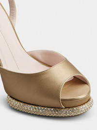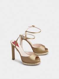 Characterized by a platform embellished with crystals, these open-toe sandals feature a covered high heel and ankle strap with mini Viv' Choc buckle. Crafted in satin, this alluring style comes with the emblematic heart on the insole. Description & details Silk blend satin Suede detailing Ankle strap with mini rhinestone buckle Leather insole with heart-shaped insert Heel 12 cm Leather outer sole Mod: RVW73338620RS0C603