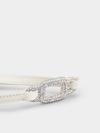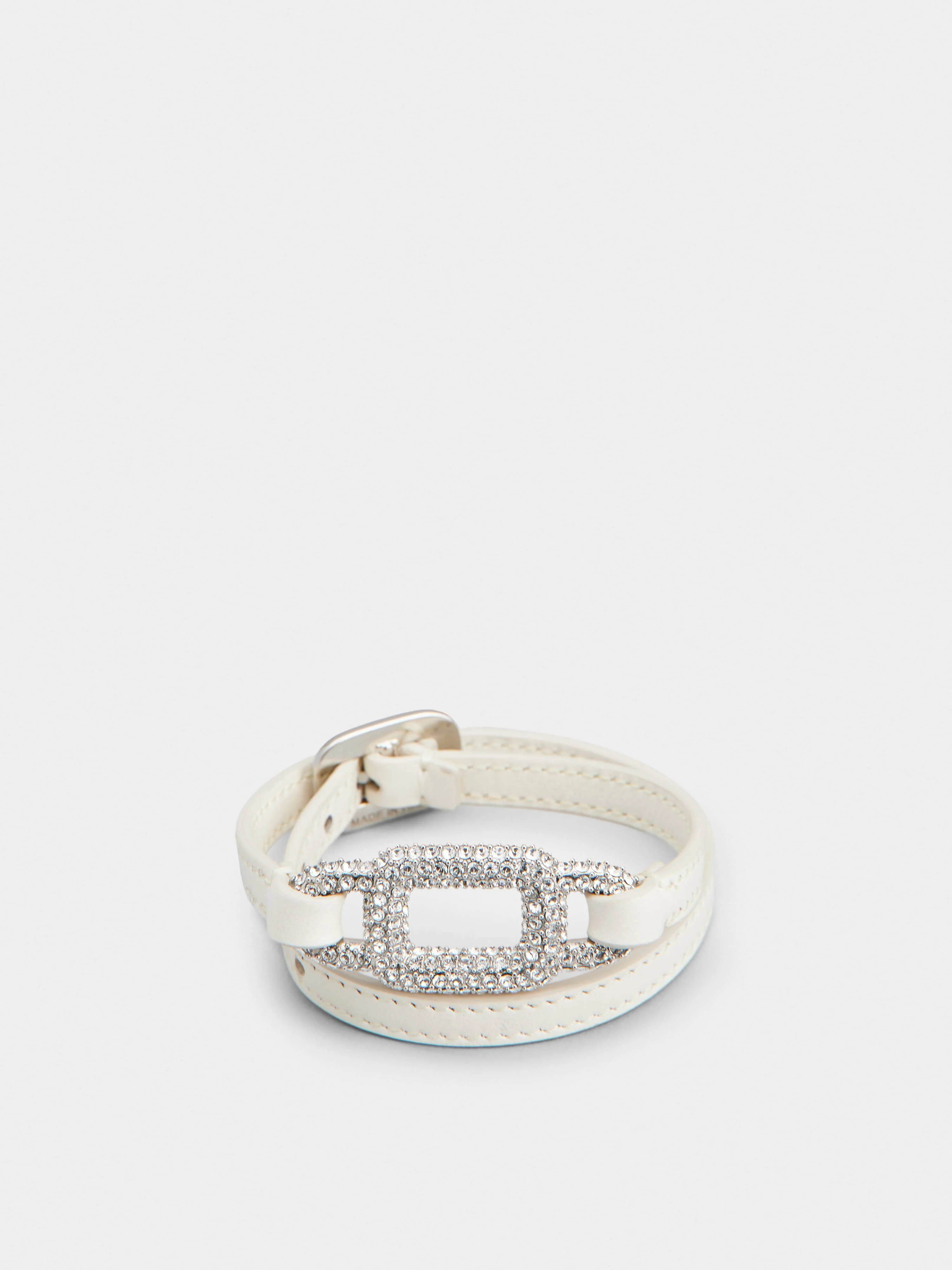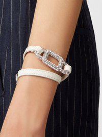 Double wrap bracelet with iconic crystal buckle, featuring the characteristic rounded shape. With adjustable length, this elegant accessory is crafted in soft leather with matching stitching. Description & details Made in Italy Item crafted in leather and metal Crystal buckle Adjustable length Maintenance and care cards included Mod: REWB1140100XMAC019