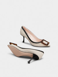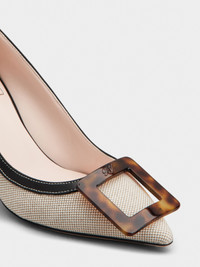 Modern and versatile, the Viv' in the City is characterized by a resin tortoise effect buckle and a stiletto heel. These bi-material pumps, in canvas and leather, add the final touch to a metropolitan woman's allure. Description & details Fabric Calfskin leather detailing Resin buckle Leather lining and insole Leather outer sole Stiletto heel Heel height 2.6 ins Made in Italy Mod: RVW61844530UYA9R21