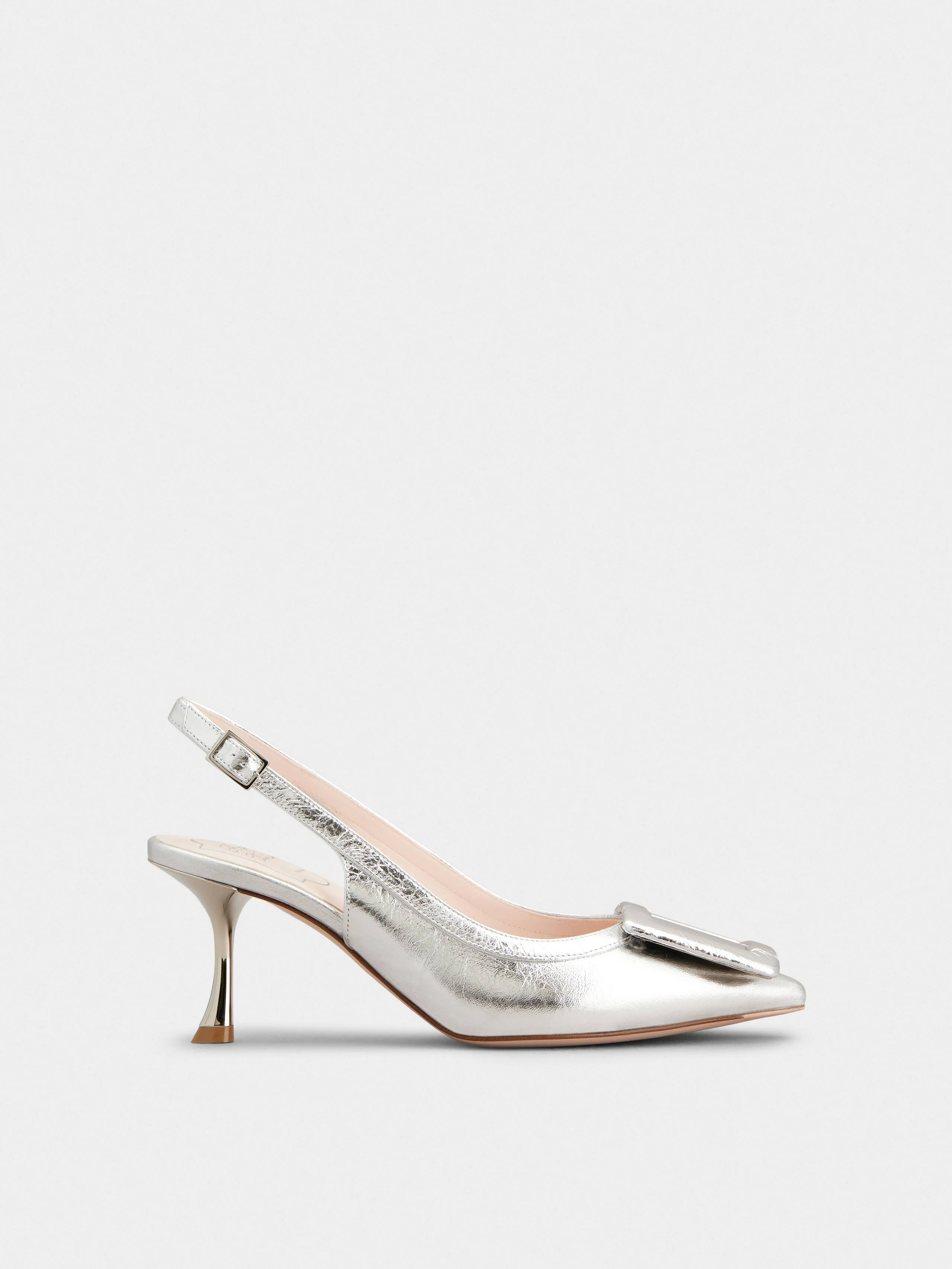 Modern and versatile, the Viv' in the City is characterized by a covered buckle and a stiletto heel. Crafted in metallic leather, these slingback pumps add the final touch to a metropolitan woman's allure. Description & details Ovine leather Covered buckle Heel strap Leather insole Leather outer sole Stiletto heel Heel height 2.6 ins Made in Italy Mod: RVW61837770T0HB200