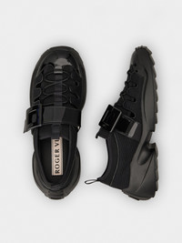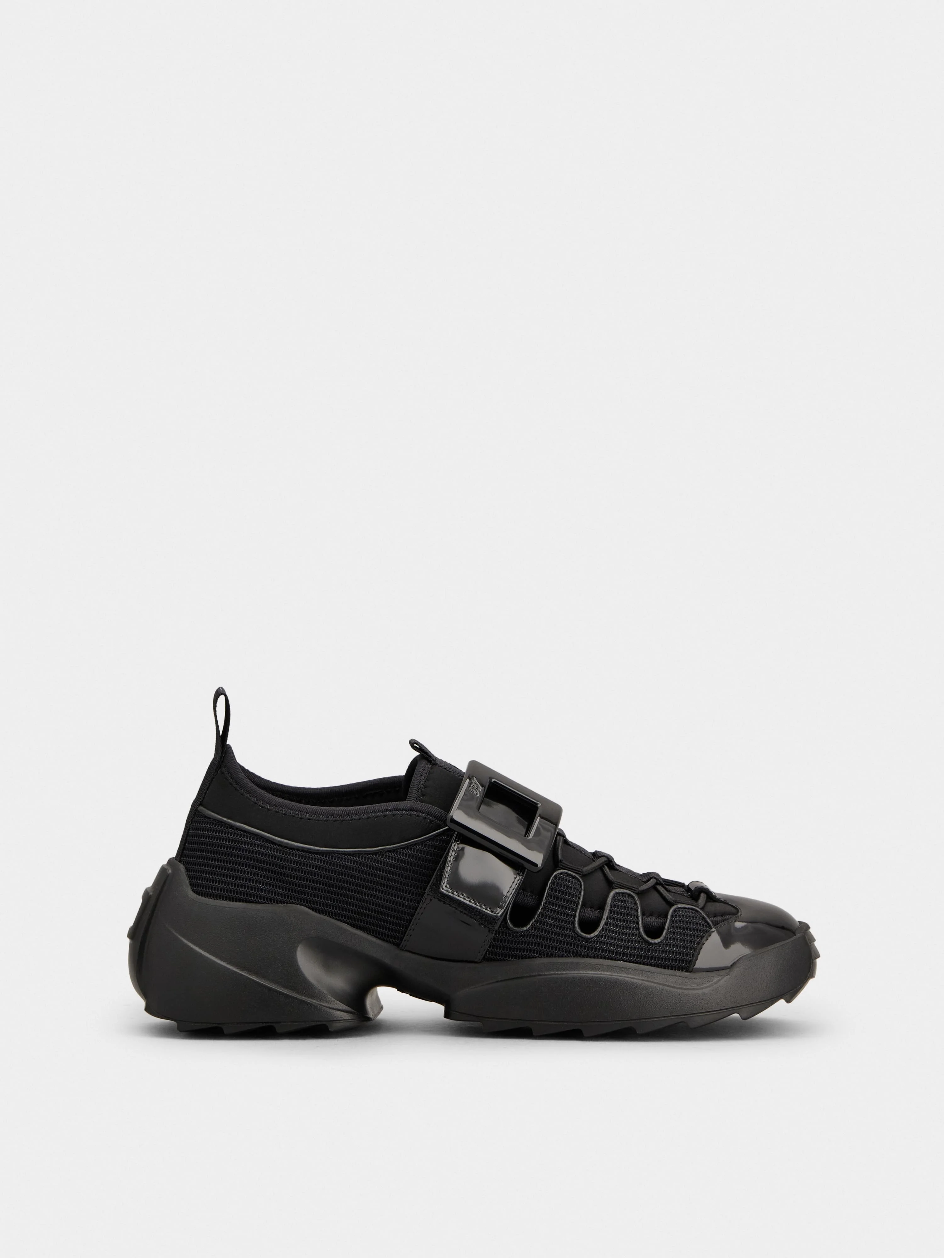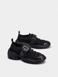 The Viv' on the Run are sneakers with a serrated outer sole, here featuring a trekky upper. Crafted in mesh and patent leather, they are adorned by a lacquered buckle. A comfortable style that adds a Vivier touch to a decontracte look. Description & details Fabric and patent calfskin leather Strap with lacquered buckle Rubber outer sole Mod: RVW75642670TU5B999