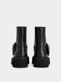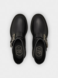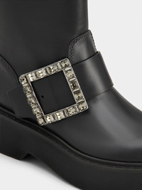 The Maison interprets the urban style with the Viv' Rangers collection. Crafted in leather, these high-soled booties are adorned with the iconic crystal buckle. Sophisticated and comfortable at once. Description & details Calfskin leather Crystal buckle Leather insole Rubber platform outer sole Made in Italy Mod: RVW74039630TTQB999
