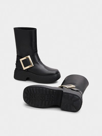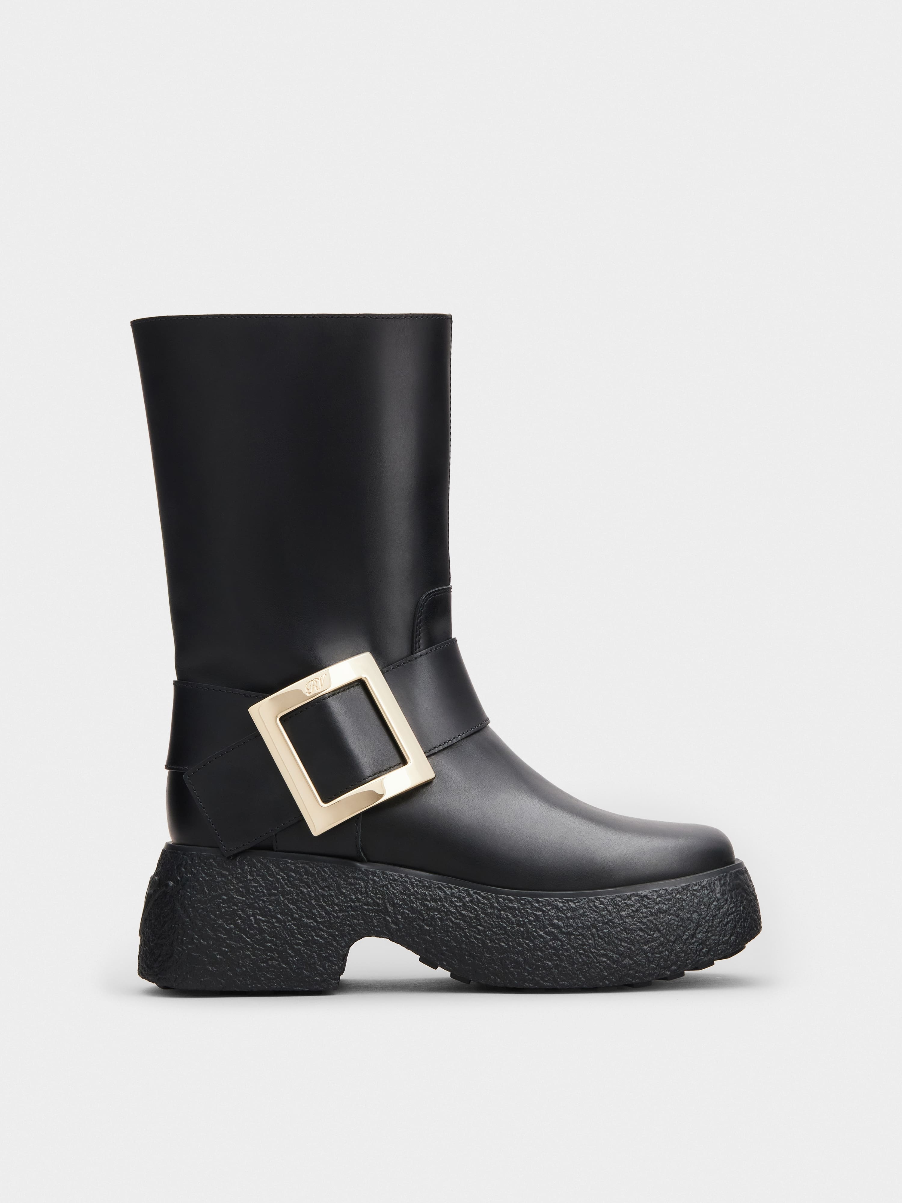 Boots have crossed over from utilitarian to fashion must-have with the Viv' Rangers Platform Metal Buckle Biker Boot. Finely hand crafted in leather, elevate the trend with this stylish pair with a platform sole and the Maison's signature metal buckle - giving your tough girl look that distinct Vivier touch. Description & details Made in Italy Leather upper Slightly squared toe Strap with branded metal buckle Light rubber flatform outsole, max 2.5 ins Maintenance and care cards included Branded dustbag Mod: RVW64231720QGWB999