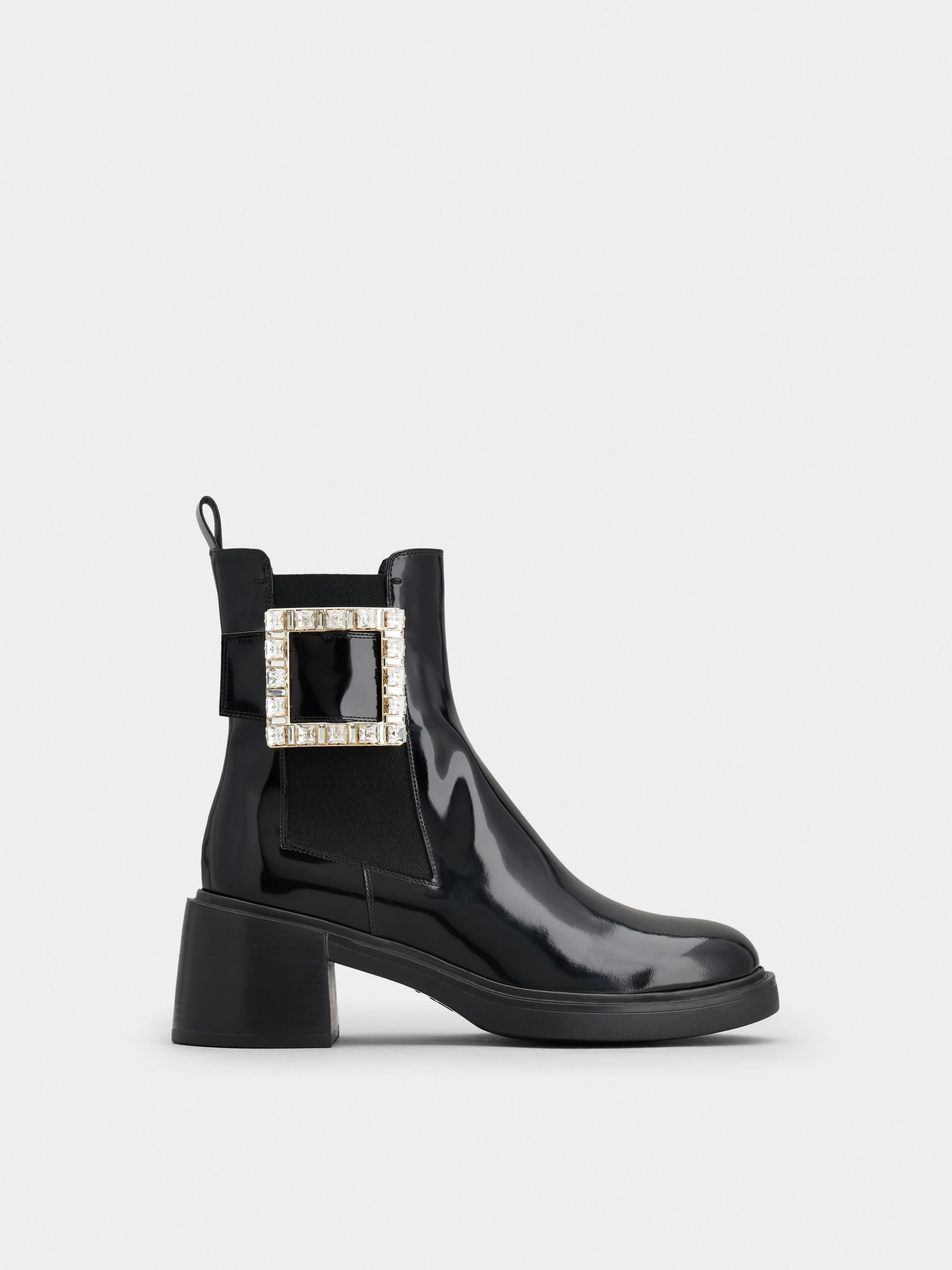 The Viv' Rangers Strass Buckle Chelsea Ankle Boots in leather express a femininity that is bold and sophisticated at once. Brightened by the iconic oversized crystal buckle on the side strap, they come with a comfortable block heel that makes them perfect for the everyday look. Description & details Made in Italy Patent leather upper Side elastic inserts Crystal side buckle Rubber outsole Heel 2.4 ins Maintenance and care cards included Branded dustbag Mod: RVW598363401UJB999