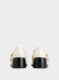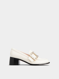 Timeless class and contemporary allure meet in these elegant patent leather loafers, handcrafted. Featuring a medium heel and leather outsole, they are adorned with the iconic crystal buckle. A true office look must-have. Description & details Made in Italy Patent leather upper Crystal buckle Leather insole Heel 2.2 ins Leather outsole Maintenance and care cards included Branded dustbag Mod: RVW72437720D1PC019