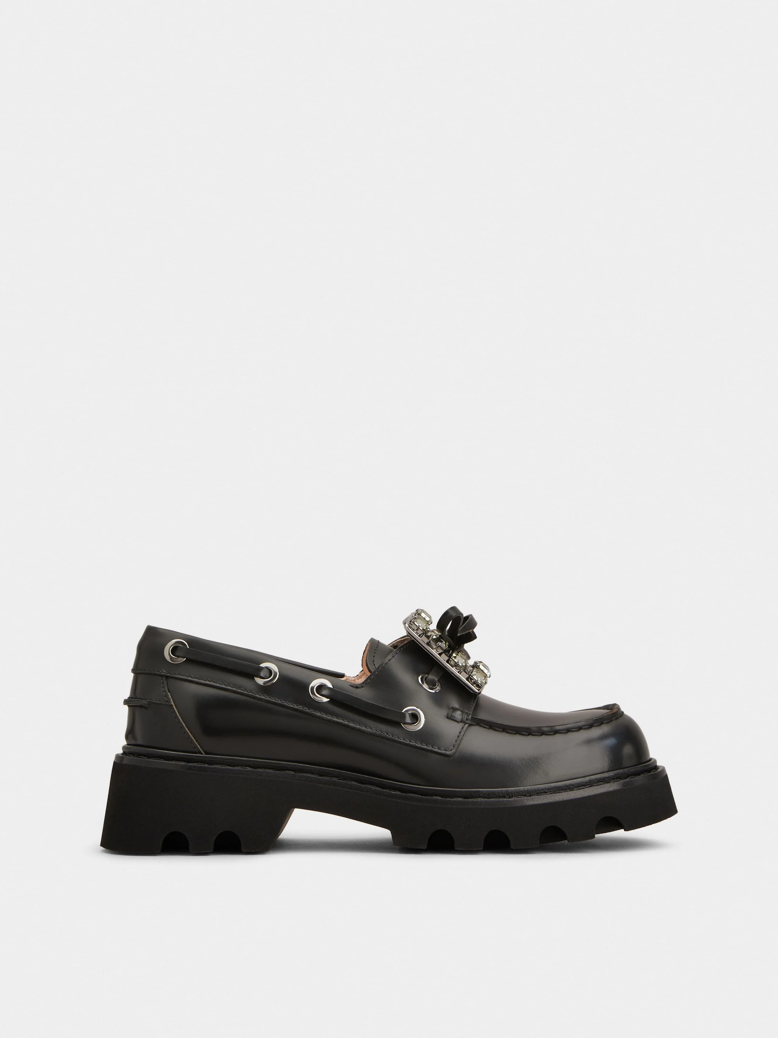 The Viv' Rangers Truck collection reinvents urban standards with a bold yet refined twist. With their thick lugged outer sole and iconic buckle, these boat shoes in leather add a strong touch to any outfit. Description & details Calfskin leather Crystal buckle Woven tie Leather welt Leather insole Rubber outer sole Made in Italy Mod: RVW78443350TWRB999