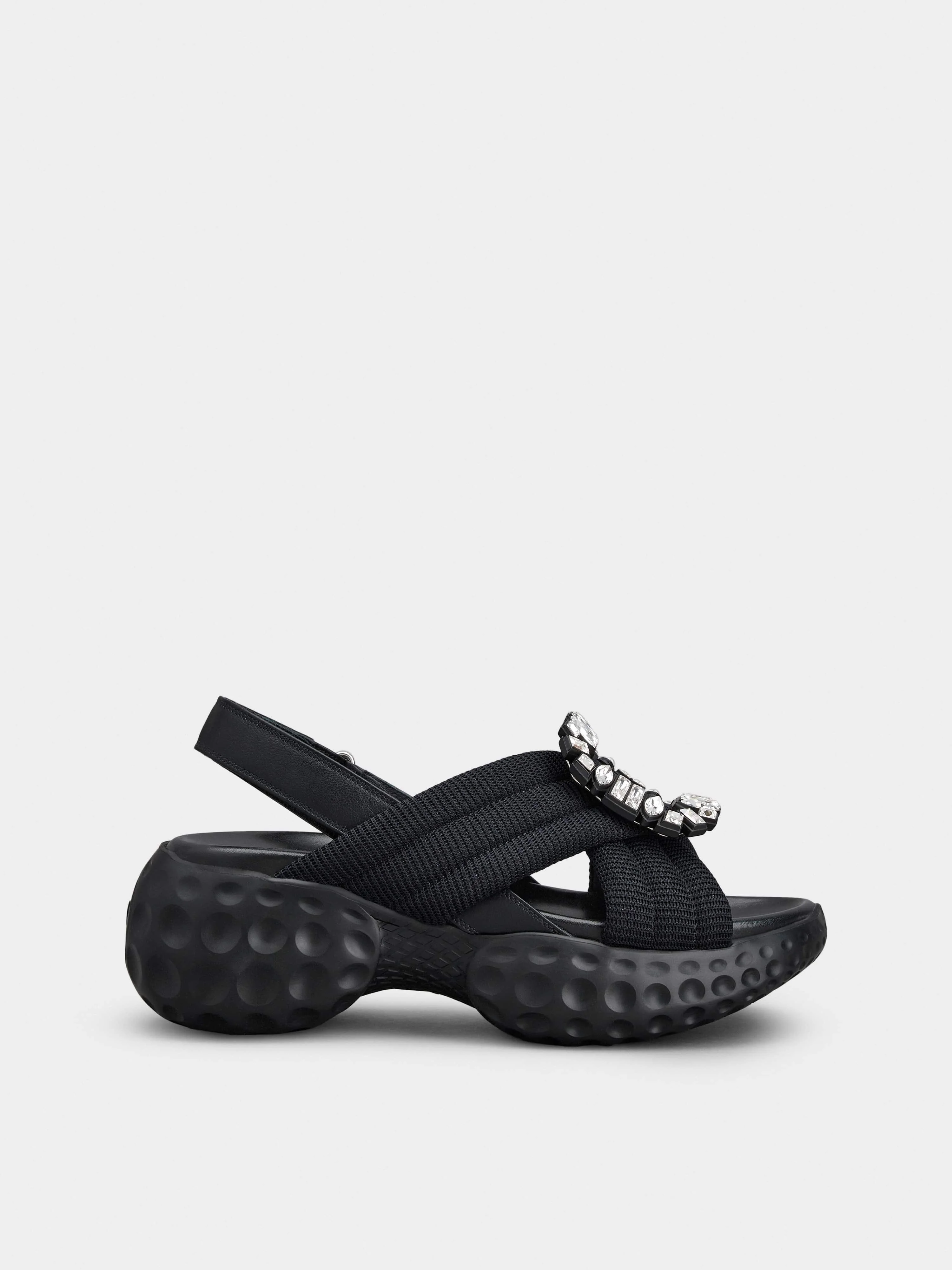 When fashion meets sports, the Viv' Run Sneaker is one of the Maison's best-loved styles. Reimagined in a sandal form, this pair is hand crafted in technical fabric and features a signature crystal buckle and a hidden Choc heel on a new cratered sole. Description & details Made in Italy Technical fabric upper Leather strap with velcro Crystal buckle Leather insole Rubber outsole max 2.9 ins Maintenance and care cards included Branded dustbag Mod: RVW66733560DX2B999