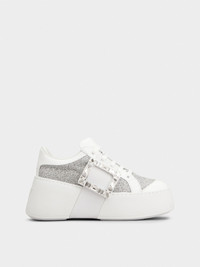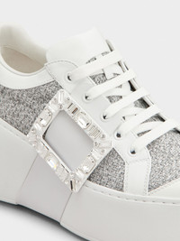 Casual and contemporary, the Viv' Skate sneakers are characterized by a high rubber outer sole. They are adorned by the iconic crystal buckle on the side. Crafted in lurex mix fabric, with leather inserts and patent leather toe, they complement the urban look with an elegant Vivier touch. Description & details Lurex mix fabric Leather inserts Patent leather detailing Crystal buckle Leather insole Rubber outer sole Made in Italy Additional laces included Mod: RVW73743310UR50351