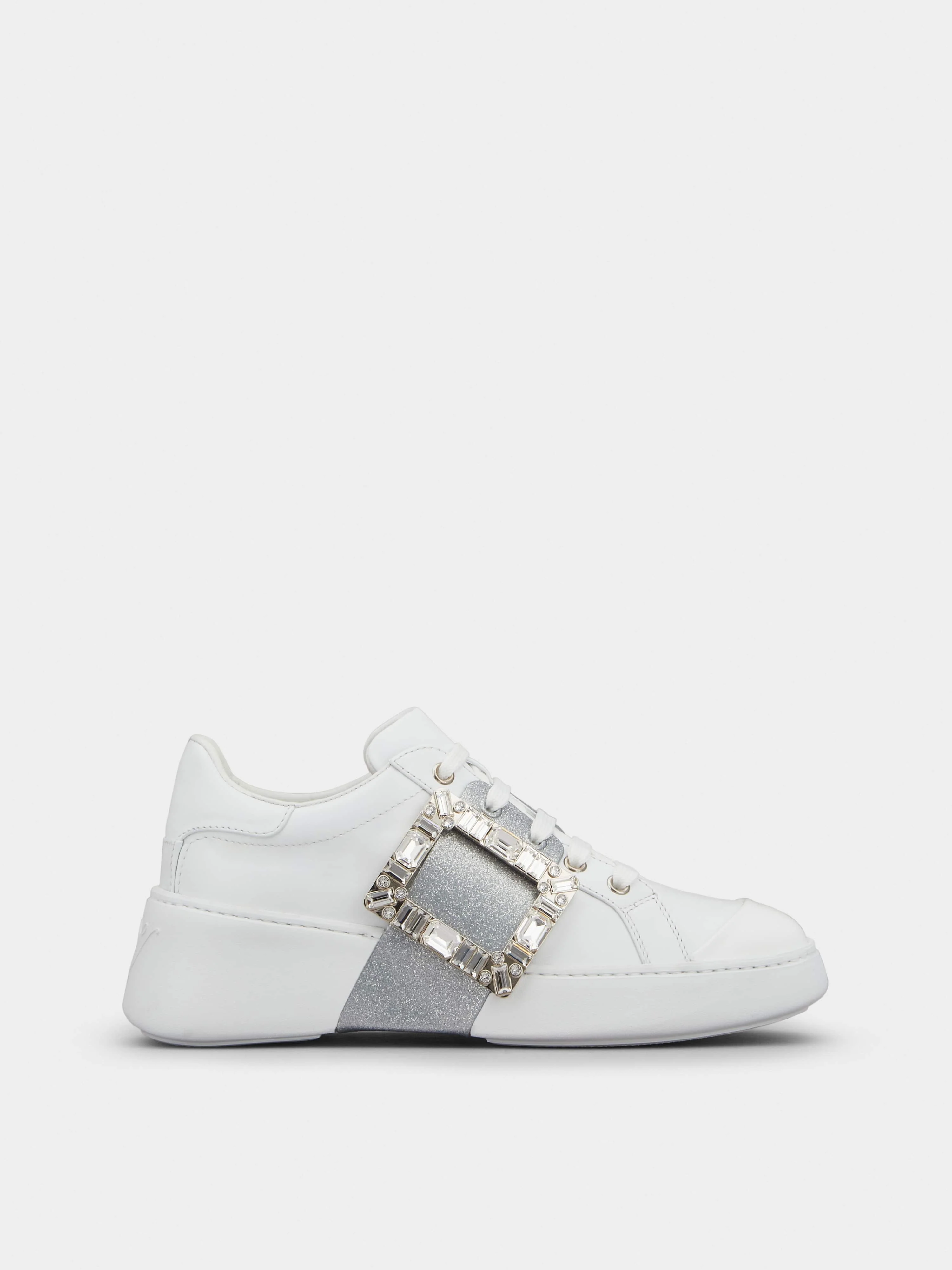 Sneakers have gone above and beyond streetwear and are now part of every woman's lifestyle. The Viv' Skate Glitter Sneaker is finely crafted in leather and now comes with a silver glitter band and a crystal side buckle - the perfect pair to accent your everyday wear. Description & details Made in Italy Soft leather upper Buckle with crystals Glitter side bands Rubber outsole Maintenance and care cards included Branded dustbag Mod: RVW54230520LXQB001