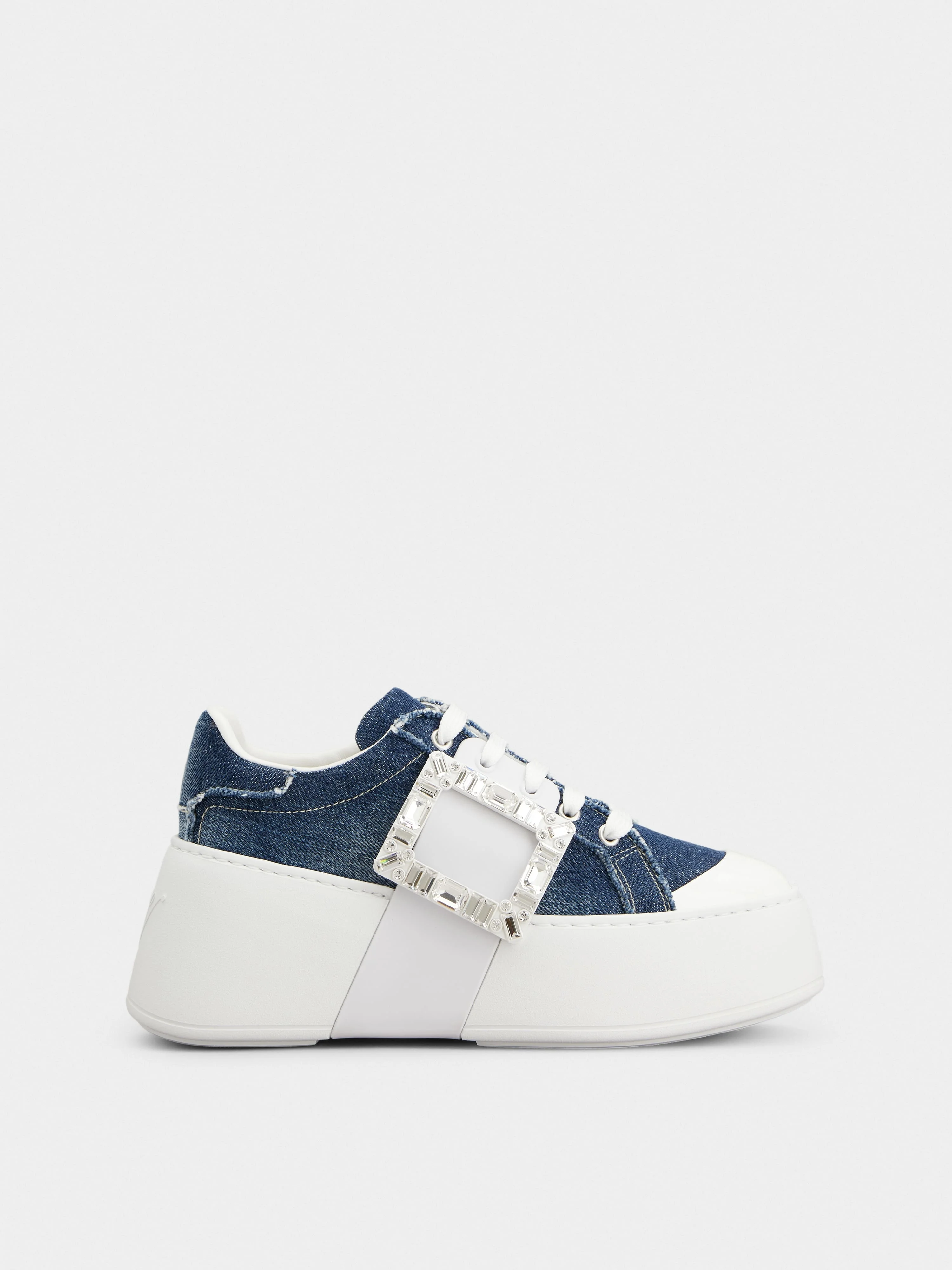 Casual and contemporary, the Viv' Skate sneakers are characterized by a rubber outer sole. They are adorned by the iconic crystal side buckle. Crafted in denim, they complement your urban look with an elegant Vivier touch. Description & details Cotton Fringed detailing Patent calfskin leather inserts Crystal buckle Leather insole Rubber outer sole Made in Italy Mod: RVW737330603NZ145I