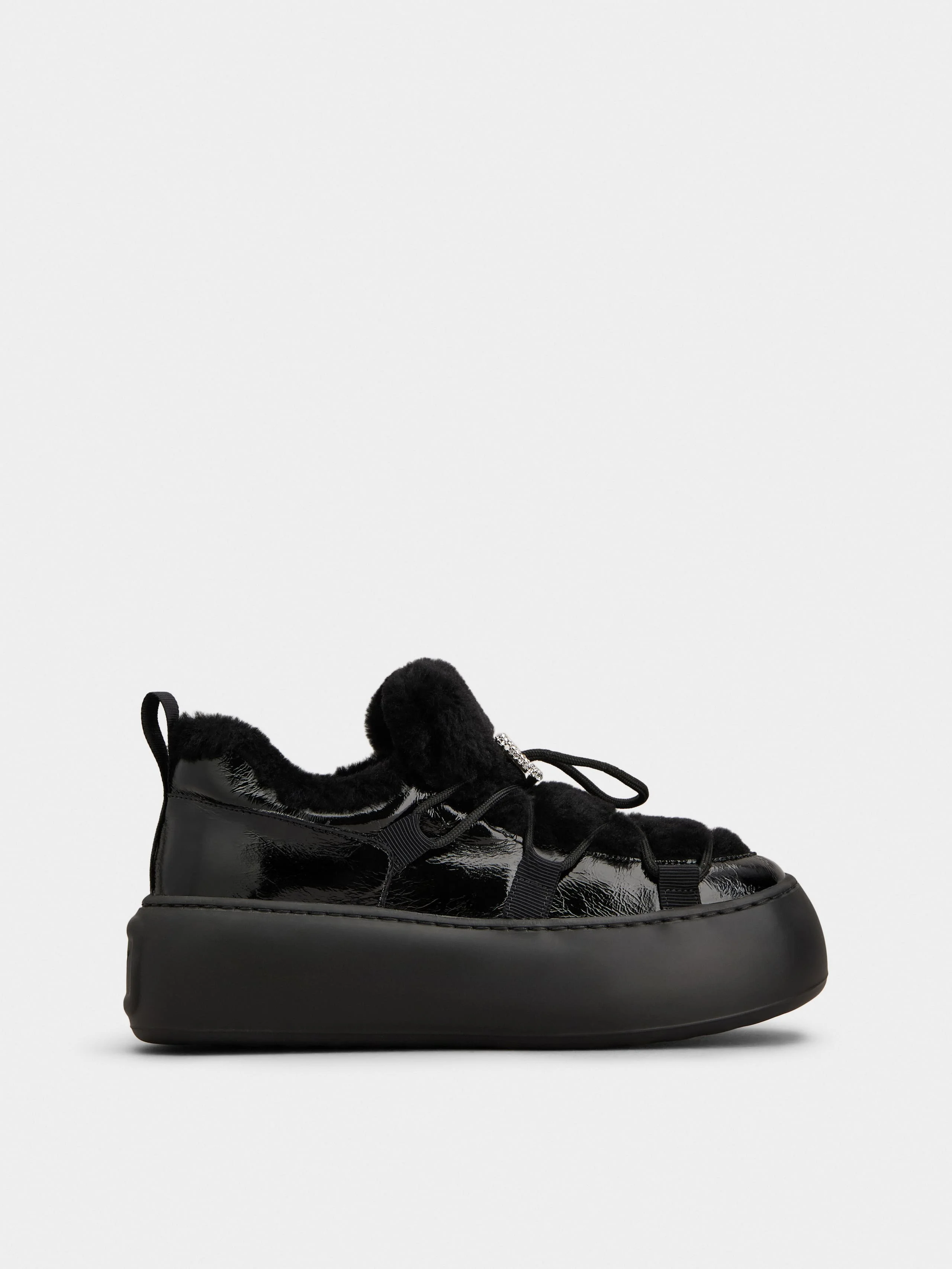 The new slip-on sneakers, inspired by the 60s Space Age, feature lightness and volume. Designed to feel like walking on cushions, they come with soft, rounded details. The 2 ins high outer sole is crafted in lightweight, flexible EVA, like yoga mats. The upper is crafted in patent leather and shearling, with a crystal buckle as a drawstring stopper. A model that adds a contemporary Vivier touch to a casual look. Description & details Patent leather Shearling inserts and lining Drawstring with crystal buckle Grosgrain detailing Rubber outer sole Outer sole height 2 ins Made in Italy Mod: RVW73943390US7B999