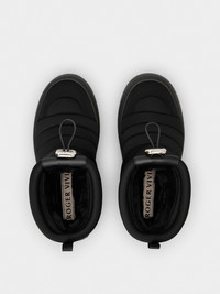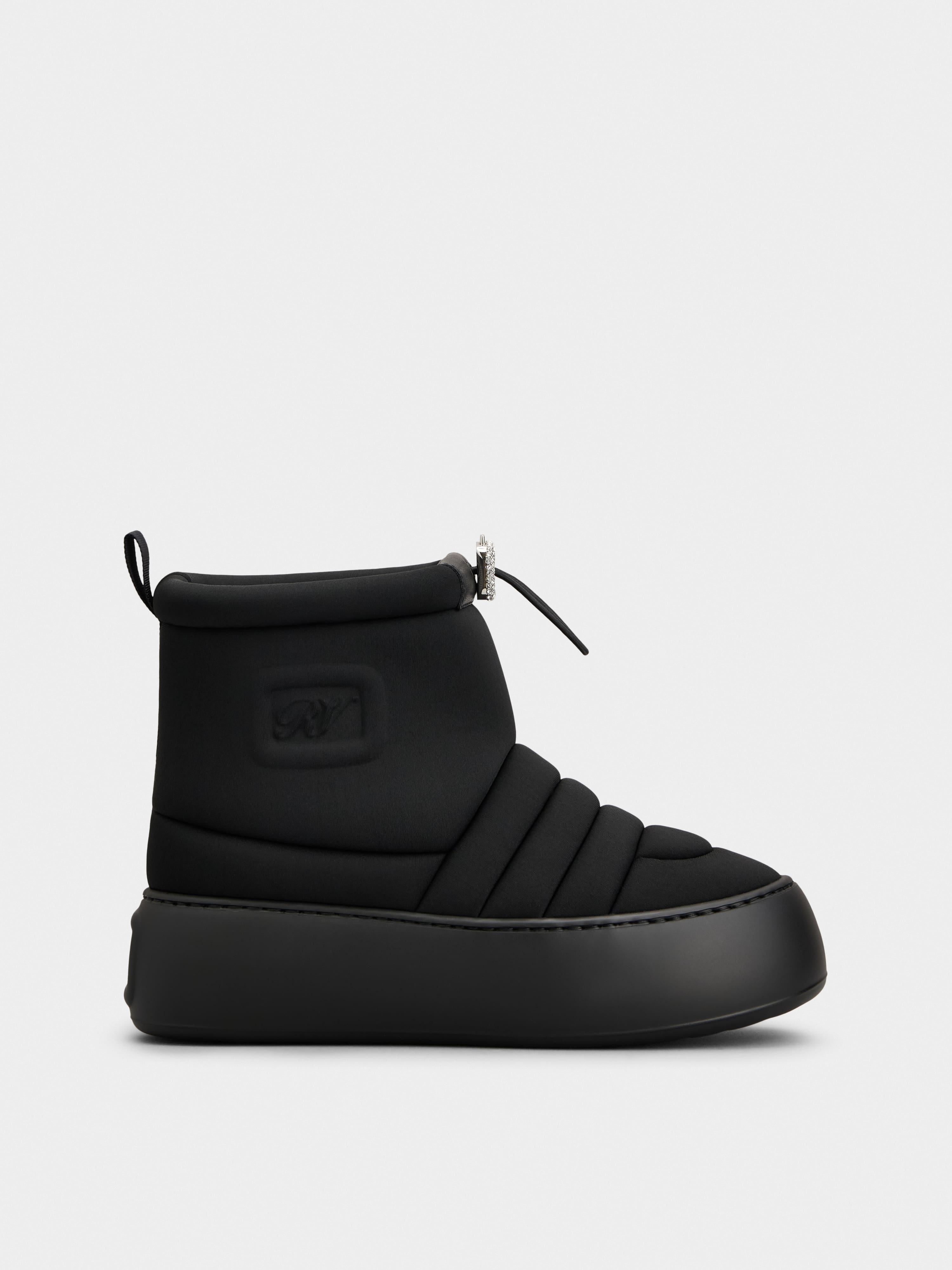 The new booties, inspired by the 60s Space Age, feature lightness and volume. Designed to feel like walking on cushions, they come with soft, rounded details, a drawstring with crystal buckle and sheepskin lining. The 2 ins high outer sole is crafted in lightweight, flexible EVA, like yoga mats. The upper is crafted in quilted fabric, for ultimate comfort. A model that adds a contemporary Vivier touch to a casual look. Description & details Fabric Embossed Roger Vivier logo on the side Drawstring with crystal buckle Sheepskin lining and insole Rubber outer sole Outer sole height 2 ins Made in Italy Mod: RVW73940370U05B999