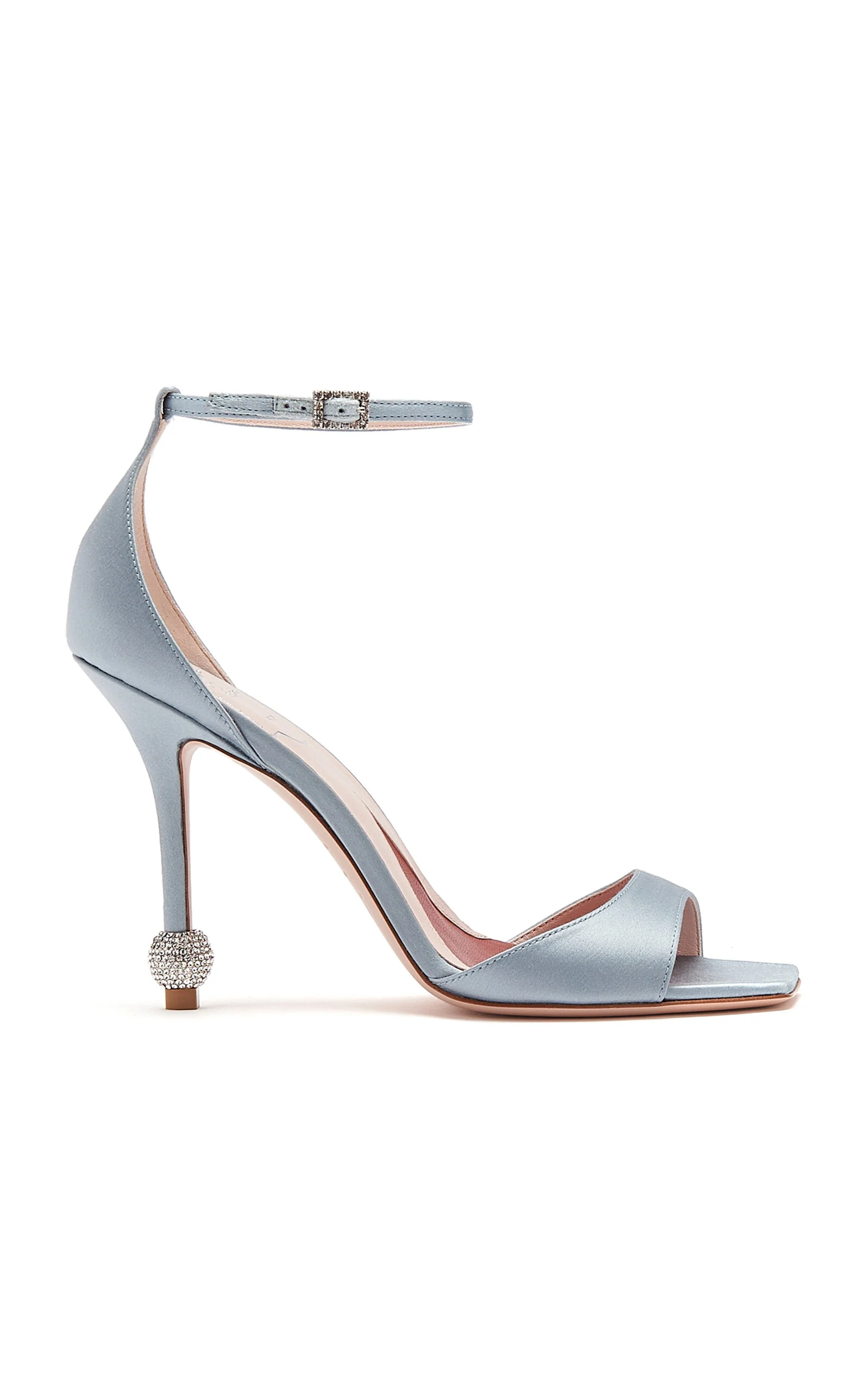 PRODUCT DETAILS - Heeled sandals silhouette, satin body, ankle strap, strass heel embellished, square open toe, lined - Buckle fastening - Composition: satin, leather - Made in Italy SIZE & FIT - Heel height measures 100 mm