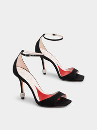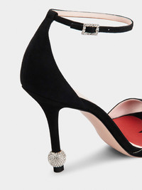 The Vivier Marlene Strass sandals feature a stiletto heel with a crystal-covered boule, a creation inspired by Monsieur Vivier's 1953 design for Marlene Dietrich. Hand crafted in suede, the sandals feature a stitched heart on the insole, just like the I Love Vivier range, a squared toe, an adjustable strap at the ankle and a small, rhinestone buckle. Wear them to your next party, for seductive and timeless allure. Description & details Made in Italy Suede upper Suede covered heel 4 ins Ankle strap with rhinestone buckle Leather outsole Maintenance and care cards included Branded dustbag Mod: RVW56827490HR0B999
