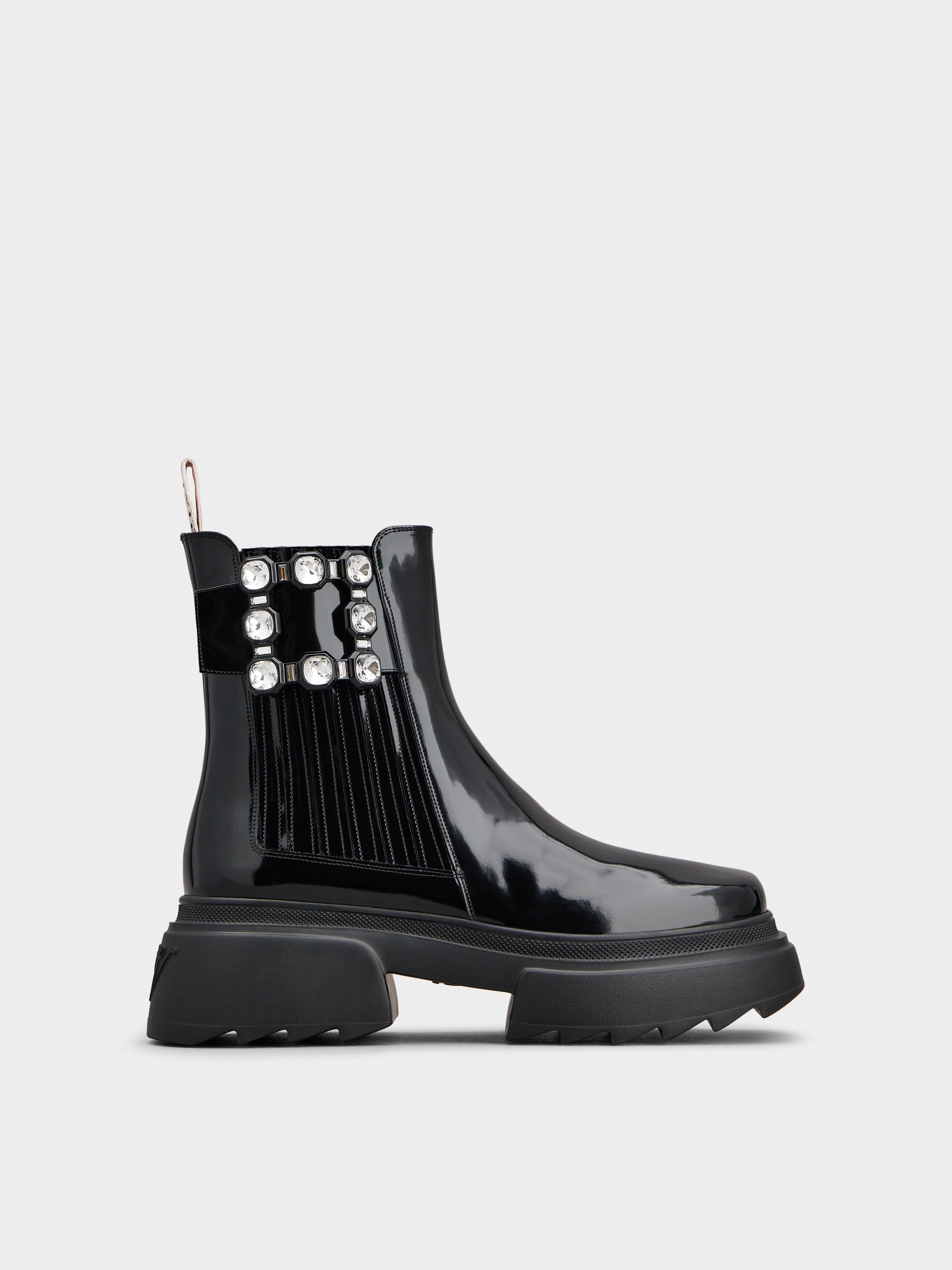 In its many feminine declinations, the Vivier style always expresses a strong personality. The Wallaviv collection also combines elements of precious elegance with a chunky outsole with a decidedly bold personality. Crafted in shiny patent leather, the Wallaviv Strass Buckle Chelsea Ankle Boots feature a crystal side buckle and a serrated rubber outsole. Tough girl attitude, with an unmistakable Vivier touch. Description & details Made in Italy Patent leather upper Squared toe Side elastic inserts Side strap Crystal buckle Leather insole Leather outsole Maintenance and care cards included Branded dustbag Mod: RVW710358001UJB999