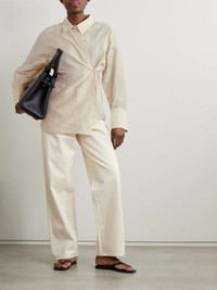 EDITORS'NOTES ROHE's collections offer a fresh spin on tailoring, and the results are always timeless yet unique. This striped shirt is made from lightweight voile that's twisted at the front and has an asymmetric hem. Wear yours with jeans. SIZE & FIT Model measurements: - Fits true to size, take your normal size - Wraparound design, ties at the back for an adjustable fit - Lightweight, non-stretchy fabric - Model is 175cm/ 5'9" and is wearing a FR 36 - Bust: 79cm/ 31" - Waist: 66cm/ 26” - Hip: 91cm/ 36” DETAILS & CARE - Cream and navy voile - Button fastening at front - 61% acetate, 39% cotton - Hand wash