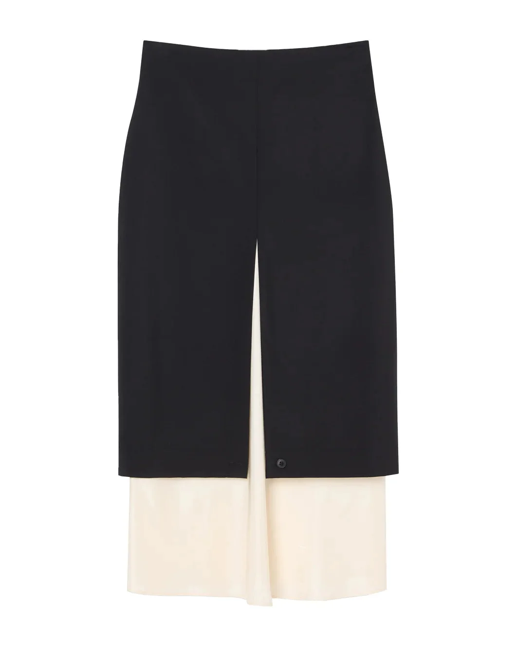 The Contrast Upside-Down Skirt in Wool Blend in the color Black by Rohe is a layered midi skirt that features a front slit, flowing contrast under layer, and a form-fitting silhouette. Your perfect pencil skirt with a twist. - Material: 73% Virgin Wool, 27% Wool Mohair - Details: Fitted. - Fit: The model is 179cm and is wearing a size 4 (FR 36). - Style it with: A tank or tucked in button up for a tailored look..