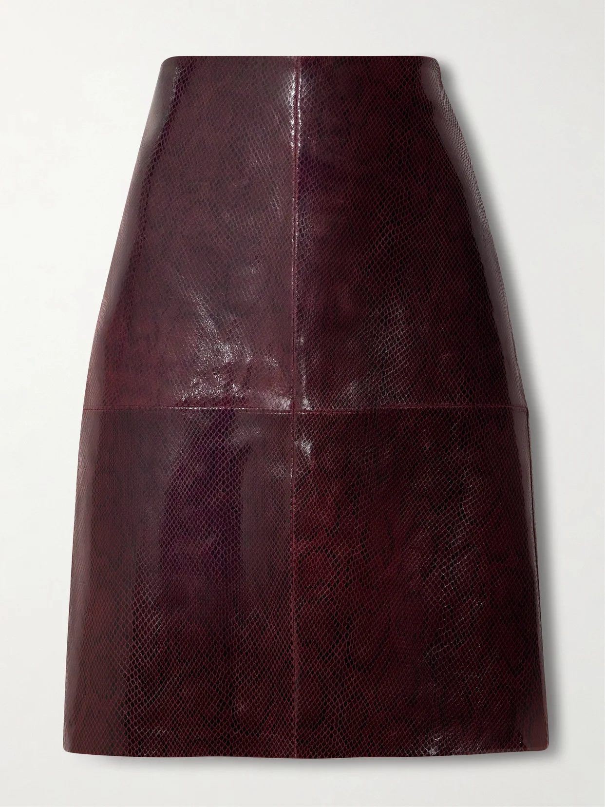 ROHE emphasizes the importance of quality materials, whether it's carefully sourcing leftover fabrics or selecting new premium options. This skirt is made from panels of burgundy snake-effect patent-leather with a beautiful sheen and subtle pattern. It sits high on the waist and has an A-line shape.