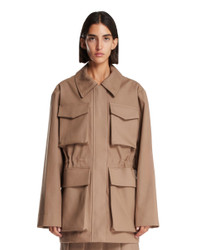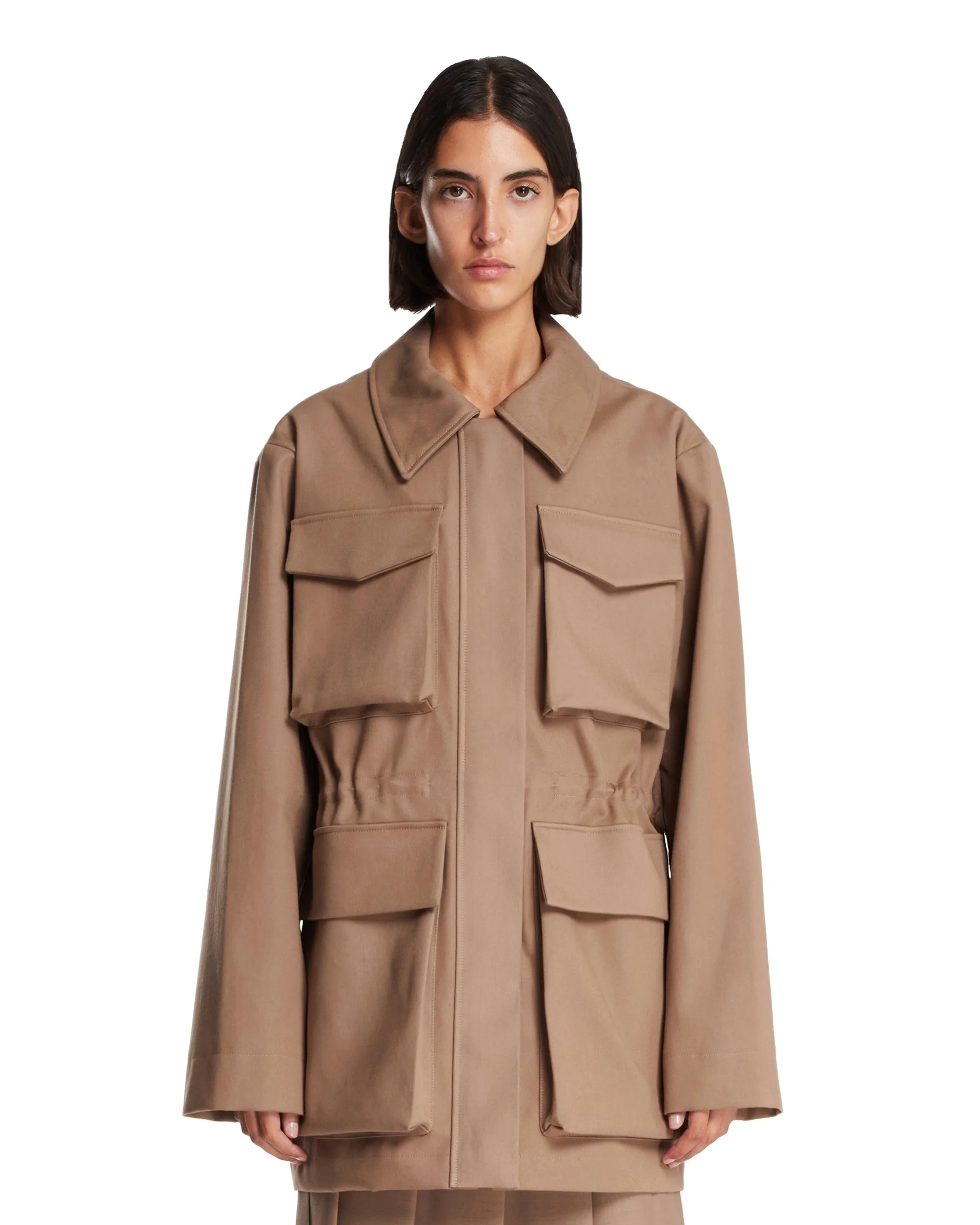 Rohe Brown Multi-Pocket Jacket. Brown pure cotton. Classic collar, long sleeves, adjustable waist, hidden front closure, multi-pocket design, straight hem. Alina is 178 cm and she is wearing a size 36. DETAILS Model: 41611011245453 Composition: 100% Cotton Made in: LITHUANIA Season: FW25-26