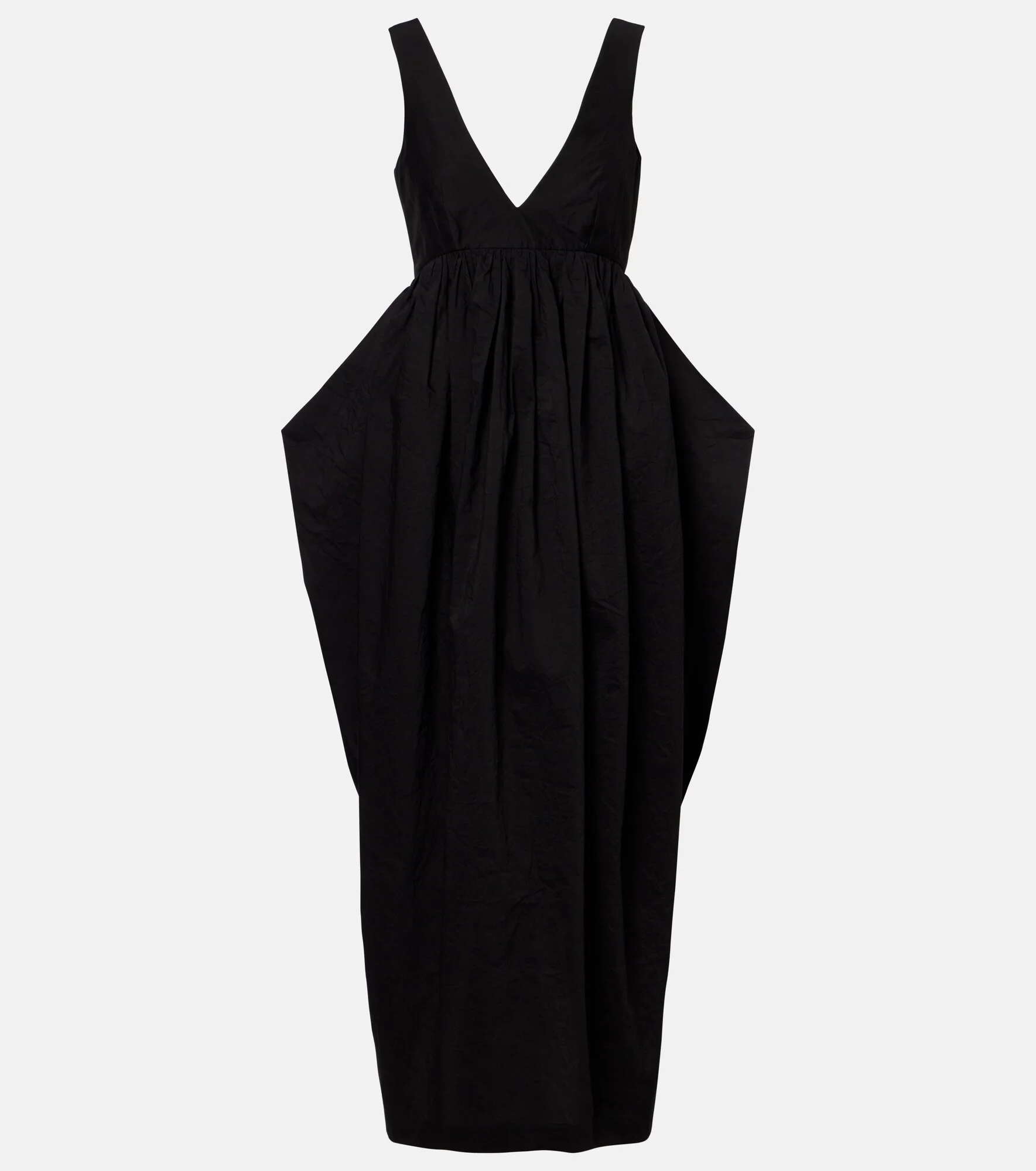 From the heart of Amsterdam, Rohe set out to create minimalist staples that defy trends and seasons. This maxi dress is crafted from a textured cotton blend and features a sculptural, trapezium-inspired silhouette with a V-neckline and subtle gathers along the waistline. Product Details - Material: 84% cotton, 16% polyamide - Care instructions: dry clean - Made in Lithuania - Color: black - Designer color name: Ivory Glow - Closure: concealed zipped back - Item number: P01159104 Size & Fit - Fits large to size - we recommend trying two sizes smaller - Low back - Cinched waist - Non-stretchy fabric - The model seen in the picture is 178cm-5'10" and wearing a size FR 32