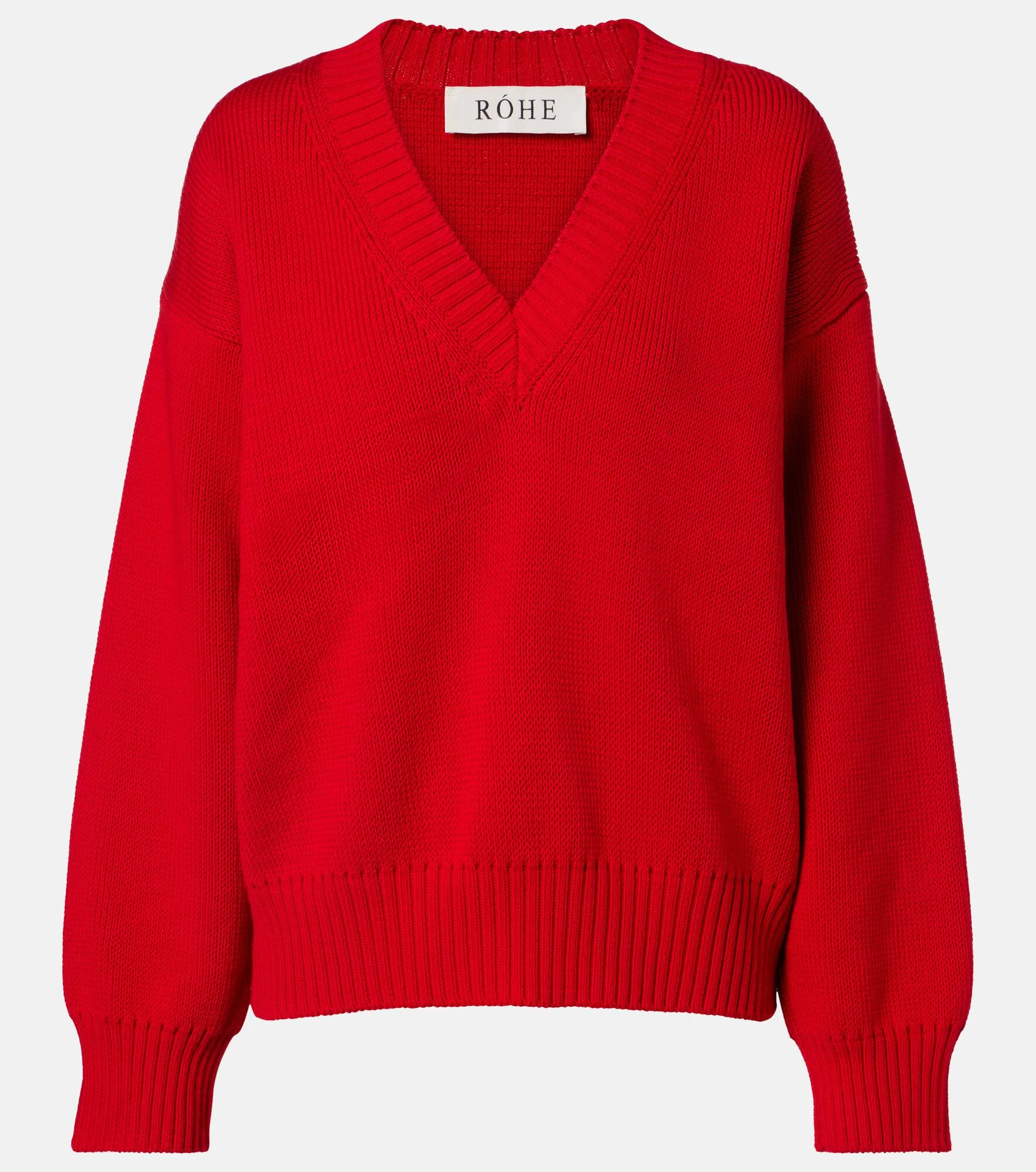 From the heart of Amsterdam, Rohe set out to create minimalist staples that defy trends and seasons. This sweater is knitted from pure cotton and features a flattering V-neckline and ribbed trims. Product Details - Material: 100% cotton - Care instructions: dry clean - Made in Italy - Color: red - Designer color name: Red - Collar: V-neck - Item number: P01140063 Size & Fit - True to size - Dropped shoulders - Designed for a loose fit - Stretchy fabric - Falls below the hip - The model seen in the picture is 178cm-5'10" and wearing a size FR 34