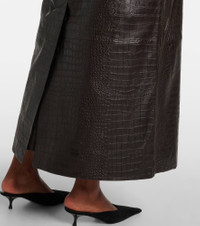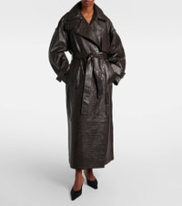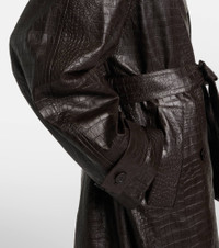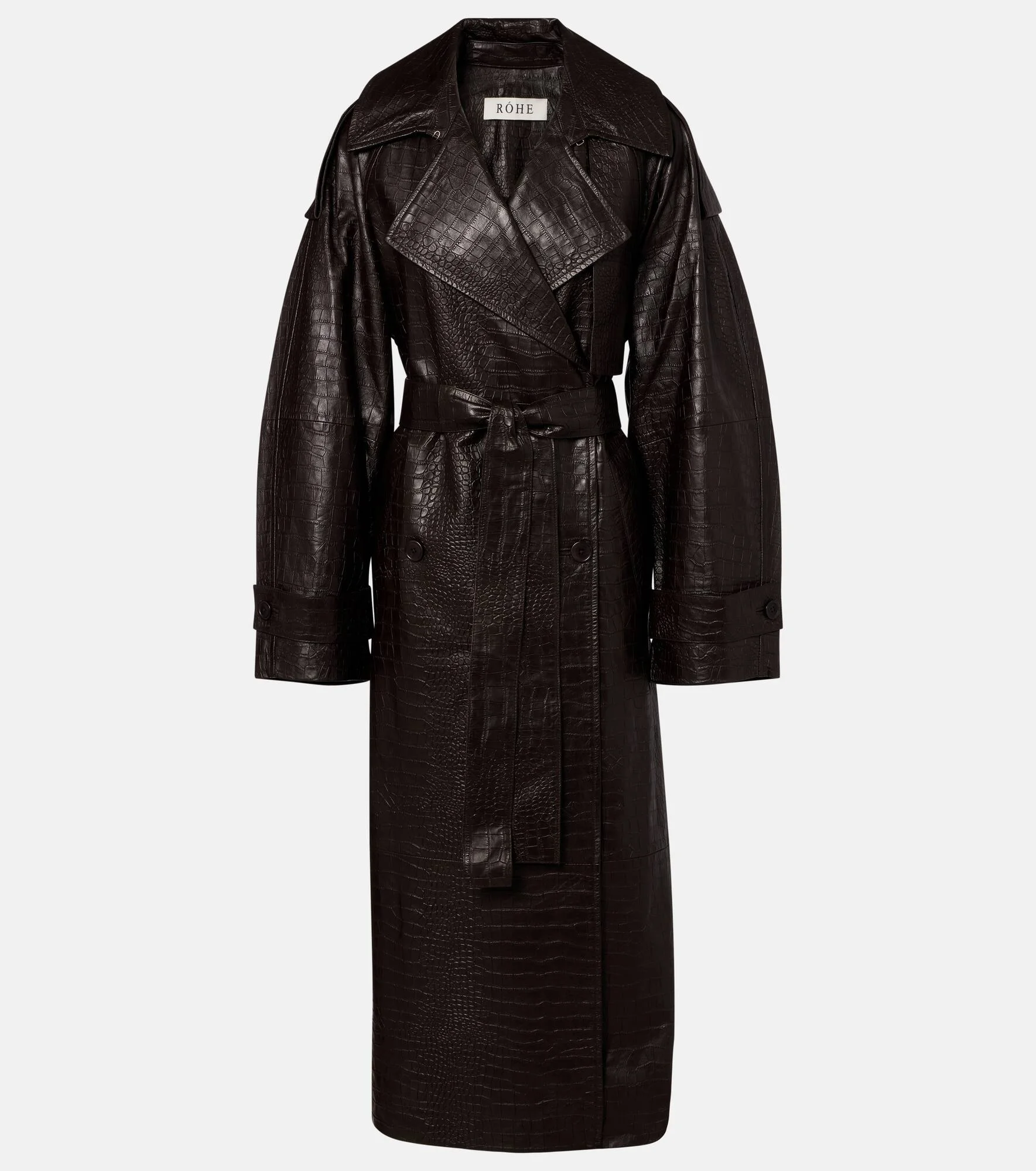 Make a statement in this Rohe trench coat. Crafted from crocodile-effect embossed leather, this piece features a buttoned high collar, double-breasted design, and a versatile removable belt. Product Details - Material: 100% sheep leather - Care instructions: specialist clean - Made in India - Designer color name: Mahogany - Item color: brown - Lining: 100% viscose - Closure: buttoned front - Cuff: tab cuff - Pockets: slant pockets - Item number: P01103201 Size & Fit - True to size - For a closer fit, we recommend taking one size down - Dropped shoulders - Loose fit, comes with belt - Non-stretchy fabric - slit length 47cm-18.5" - The model seen in the picture is 178cm-5'10" and wearing a size FR 34