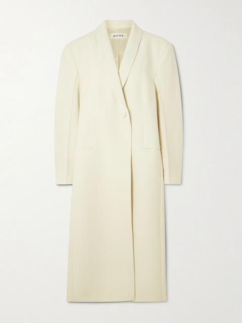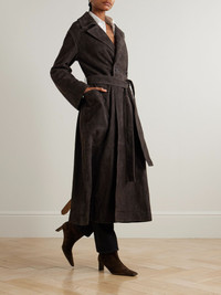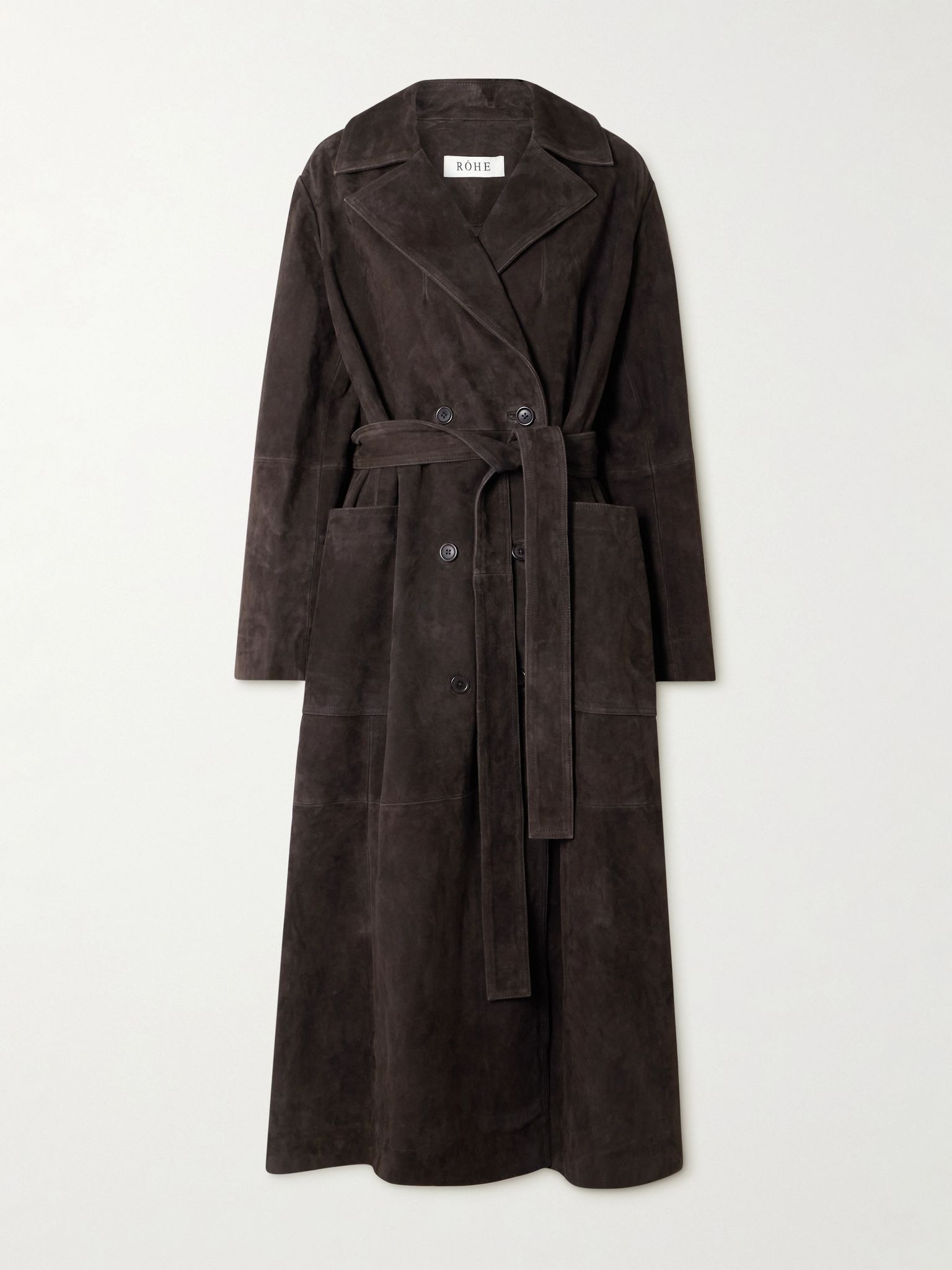 Effortlessly chic, ROHE's trench coat is made from rich dark-chocolate suede. It has patch pockets, notch lapels and a detachable belt you can use to cinch in the waist. Size & Fit - Fits true to size, take your normal size - Intended for a slightly loose fit, use the tie belt to cinch in at the waist - Supple, non-stretchy leather - Model is 180cm/ 5'11" and is wearing a FR 36 Model measurements: - Bust: 80cm/ 31.5" - Waist: 65cm/ 25.5" - Hip: 89cm/ 35" Details & Care - Dark-chocolate suede - Button fastenings through double-breasted front - 100% suede (Goat) - Fully lined - Specialist clean