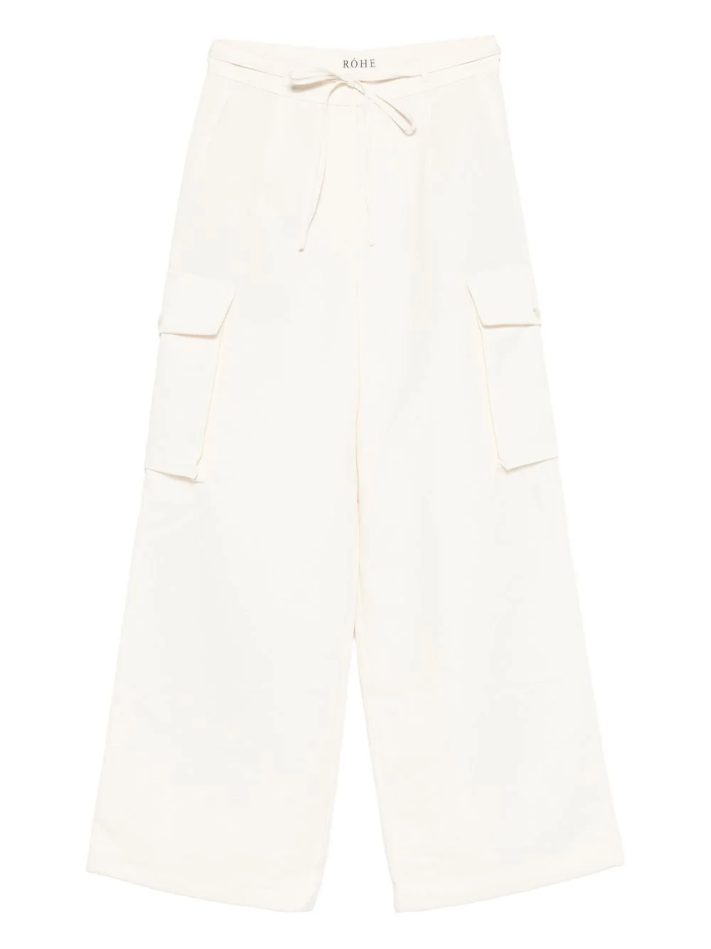 drawstring-waist cargo trousers Highlights - White - Side cargo pockets - Drawstring fastening - Wide leg - Straight hem Imported Composition Fabric 100% Washing instructions Read Manufacturer Guidelines