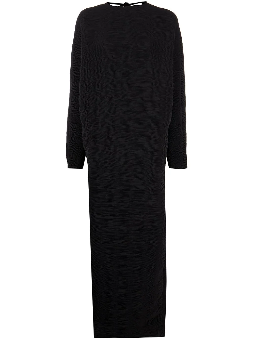 Emerson V-back plisse-effect midi dress black plisse effect open back round neck long sleeves long length rear slit Imported Composition Polyester 100% SIZE & FIT Model measurements Height 5 ft 10 in(1.77 m) Bust/Chest 29.92 in(76 cm) Hips 35.03 in(89 cm) Waist 24.01 in(61 cm) FittingInformation This piece fits true to size. We recommend you get your regular size Designed to be fitted at the waist and hips, loose over the leg Made with a mid-weight fabric