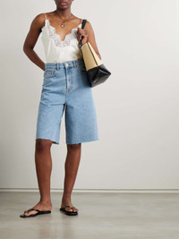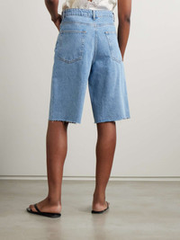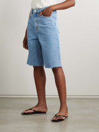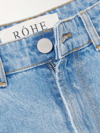 EDITORS'NOTES Consider ROHE's Bermuda shorts a cheat code to effortless summer dressing. They're made from non-stretch denim that's heavily washed and frayed along the cuffs. Take cues from the brand and dress yours up with mules. SIZE & FIT Model measurements: - Fits true to size, take your normal size - High-rise, cut for a wide-leg fit - Mid-weight, non-stretchy fabric - Model is 175cm/ 5'9" and is wearing a FR 36 - Bust: 79cm/ 31" - Waist: 66cm/ 26” - Hip: 91cm/ 36” DETAILS & CARE - Blue denim - Button and concealed zip fastening at front - 80% cotton, 20% recycled cotton - Machine wash
