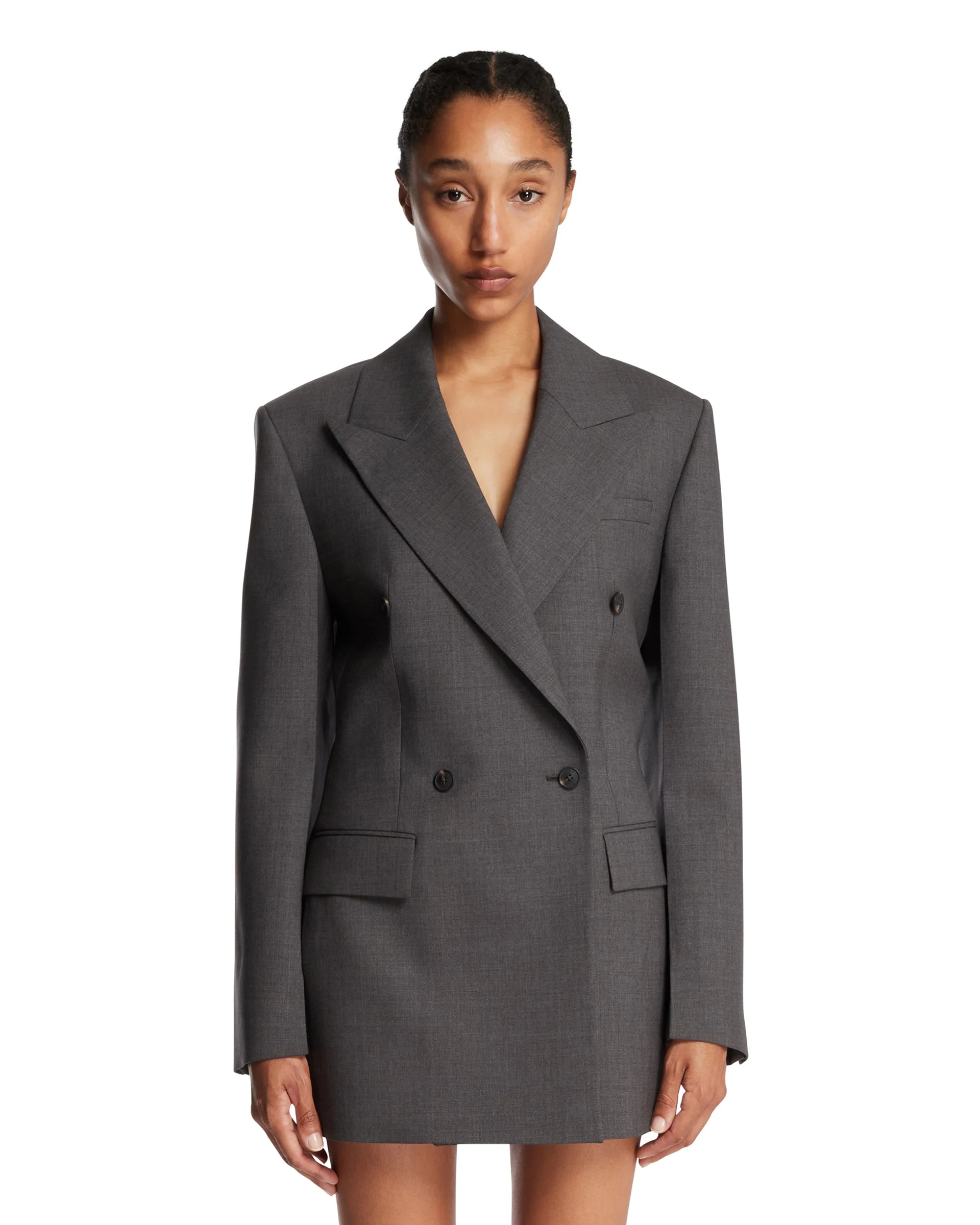 Rohe Gray Double-Breasted Jacket. Made of pure gray wool. Notched lapel collar, long sleeves, buttoned cuffs, double-breasted front closure with buttons, fitted silhouette, double vent at the back, two flap pockets on the front, welt pocket on the chest, straight hem. Aline is 180 cm and she is wearing size 36. DETAILS Model: 41711054021300 Composition: 100% Wool Made in: PORTUGAL Season: FW25-26