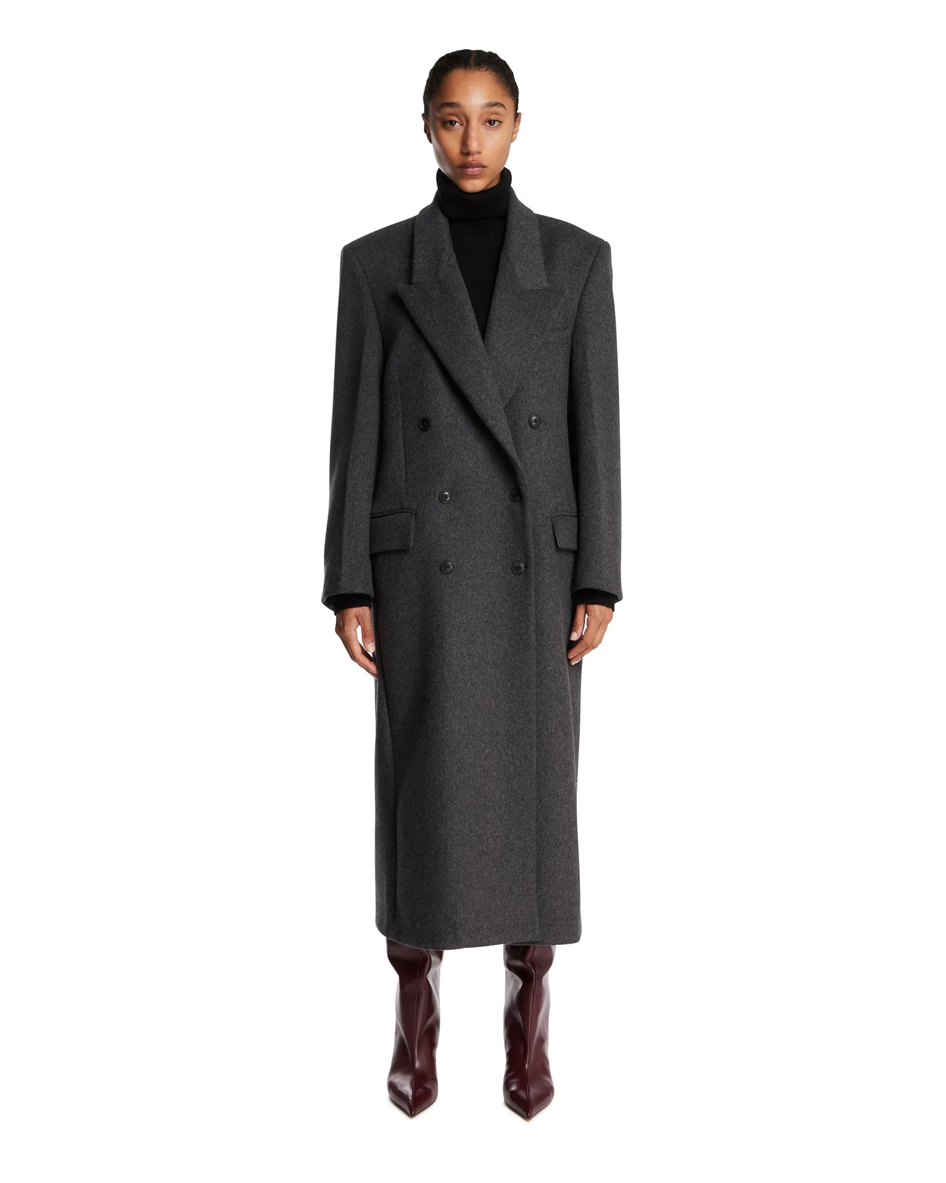Rohe Gray Hourglass Coat. Gray virgin wool, notched collar, long sleeves, buttoned cuffs, structured shoulders, double-breasted front button closure, front darts, back vent, two flap pockets on the front, welt chest pocket, straight hem. Aline is 180 cm t DETAILS Model: 41710044013368 Composition: 100% Virgin Wool Made in: ITALY Season: FW25-26