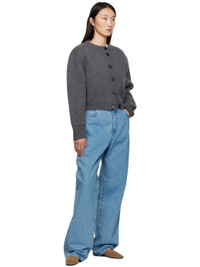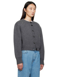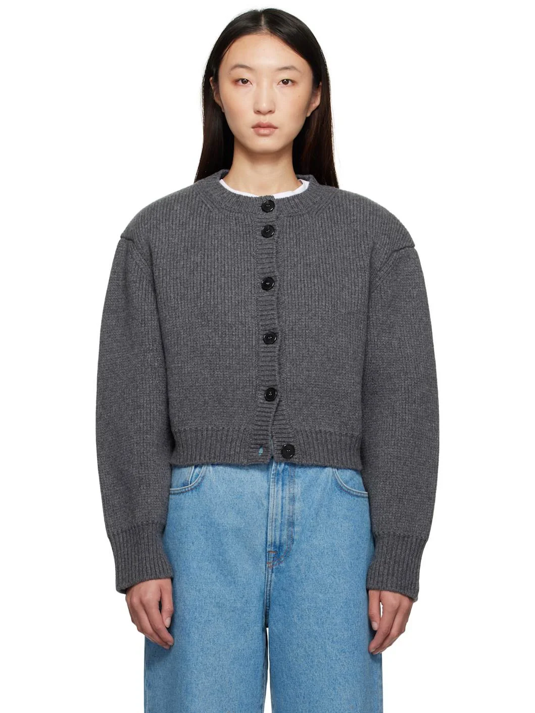 Knit wool cardigan. · Oversized · Rib-knit crewneck, placket, hem, and cuffs · Button closure · Cropped hem · Padded shoulders · Partial satin twill lining Supplier color: Mid grey melange Body: 100% wool. Trim: 100% viscose. Made in Italy 252144F095008