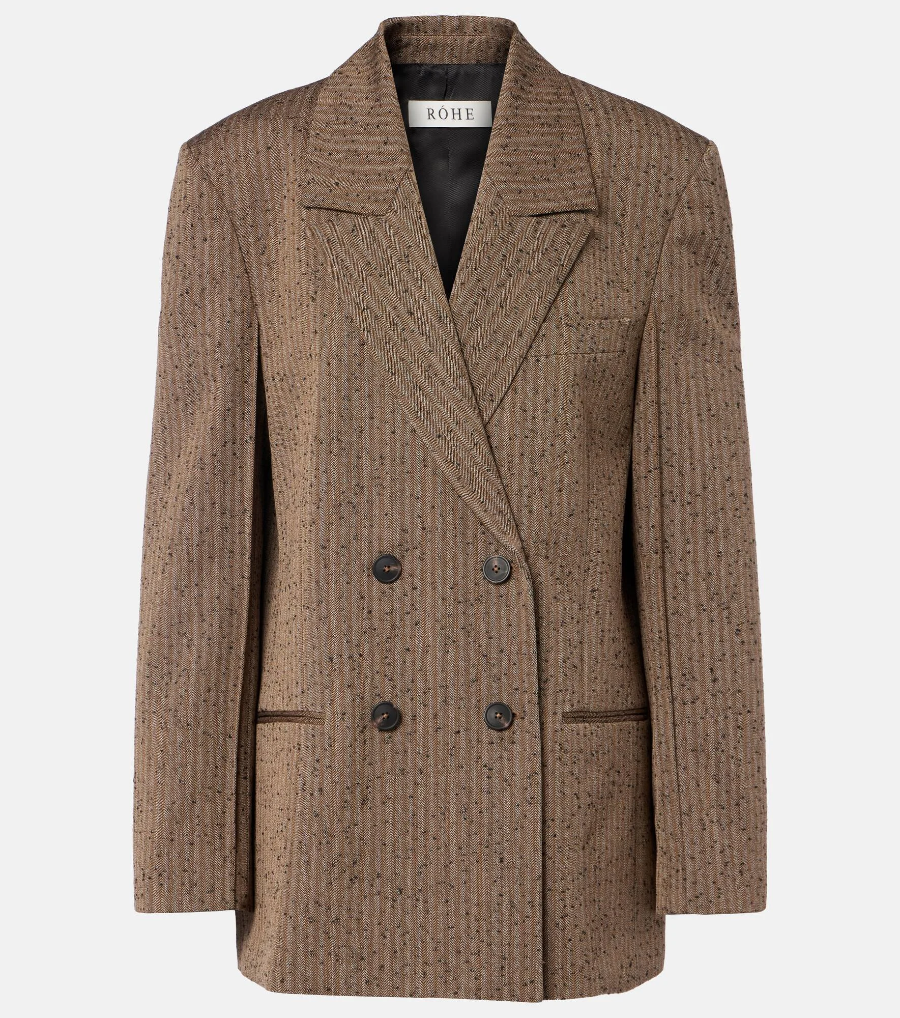 Rohe favors a multifaceted approach to design, infusing collections with elements of Dutch architecture, art, and nature. This double-breasted wool-blend blazer features a herringbone pattern. Product Details - Material: 75% wool, 18% viscose, 7% polyamide - Care instructions: dry clean - Made in Portugal - Color: brown - Designer color name: Herringbone - Item color: beige - Lining: 100% viscose - Notched lapel - Closure: double-breasted (four buttons) - Pockets: jetted, angled chest pocket, internal pocket - Item number: P01139972 Size & Fit - True to size - Shoulder pad inserts - Designed for a loose fit - Non-stretchy fabric - Falls below the hip - The model seen in the picture is 178cm-5'10" and wearing a size FR 34