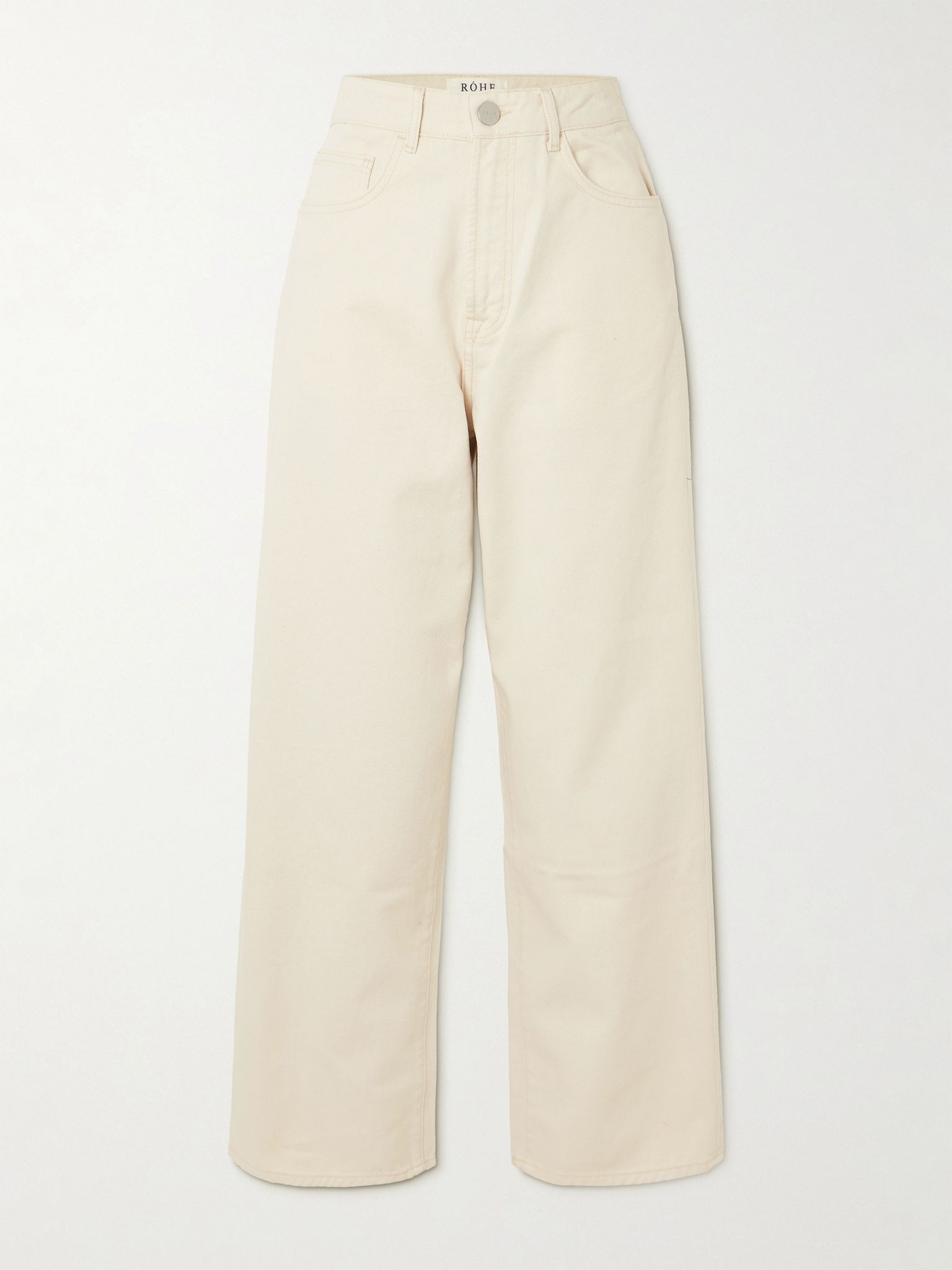 ROHE's jeans have a high waist and baggy, wide-leg shape that makes them feel so effortlessly cool. They're made from pure denim in a fresh ecru and will work with everything from sneakers to heels. Size & Fit - Fits true to size, take your normal size - High-rise, cut for a wide-leg fit - Mid-weight, non-stretchy denim - Size 36 jeans have an inside leg of 31"/ 79cm - Model is 177cm/ 5'10" and is wearing a FR 36 Model measurements: - Bust: 77cm/ 30.5" - Waist: 62cm/ 24.5" - Hip: 88cm/ 34.5" Details & Care - Ecru denim - Button and concealed zip fastening at front - 100% cotton - Machine wash