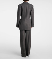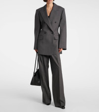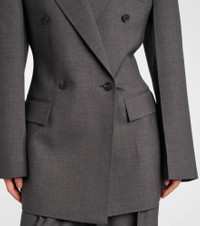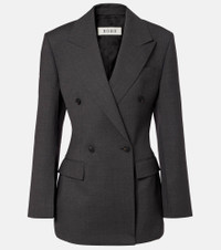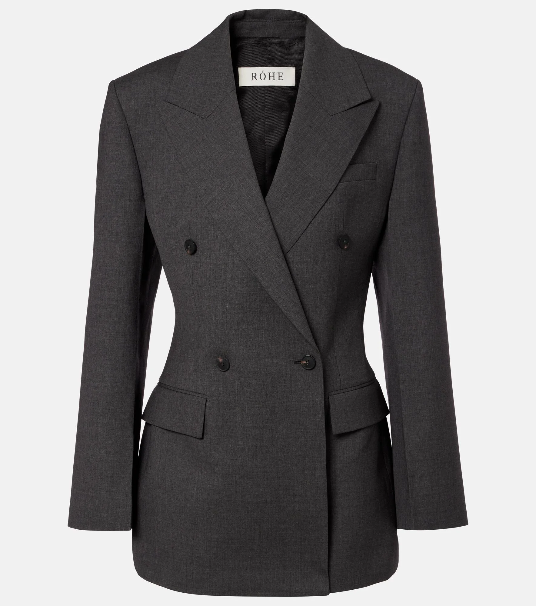 The Hourglass blazer from Rohe showcases a tailored silhouette that cinches at the waist and accentuates the shoulders. Crafted from wool, the double-breasted design features peak lapels, flap pockets, and buttoned cuffs. Product Details - Material: 98% wool, 2% elastane - Care instructions: dry clean - Made in Portugal - Designer color name: Dark Grey Melange - Item color: gray - Lining: 100% viscose - Shoulder pads - Peak lapel - Closure: double-breasted (four buttons) - Cuff: four buttons - Pockets: ticket pocket, flap pockets, internal pocket - Vent: single - Fully lined - Item number: P01103190 Size & Fit - True to size - Shoulder pad inserts - Cinched waist - Non-stretchy fabric - Falls below the hip - slit length 22cm-8.5" - The model seen in the picture is 178cm-5'10" and wearing a size FR 34
