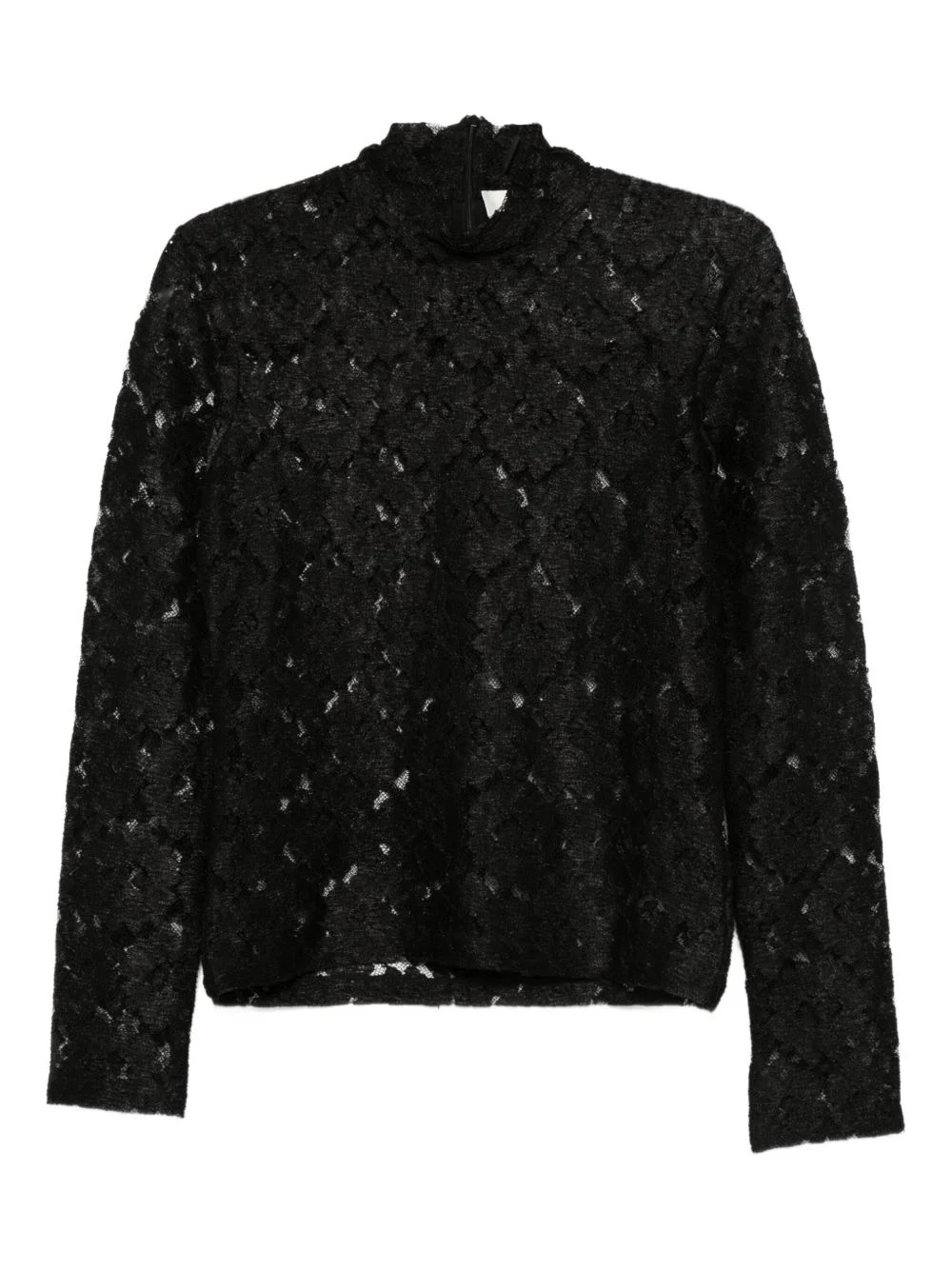 lace mock-neck T-shirt Highlights - Black - Floral lace - Mock neck - Long sleeves - Flared cuffs Imported Composition Polyester 98%, Elastane 2% SIZE & FIT Model measurements Height 5 ft 10 in(1.78 m) Bust/Chest 33.46 in(85 cm) Hips 36.22 in(92 cm) Waist 23.22 in(59 cm) Washing instructions Hand Wash