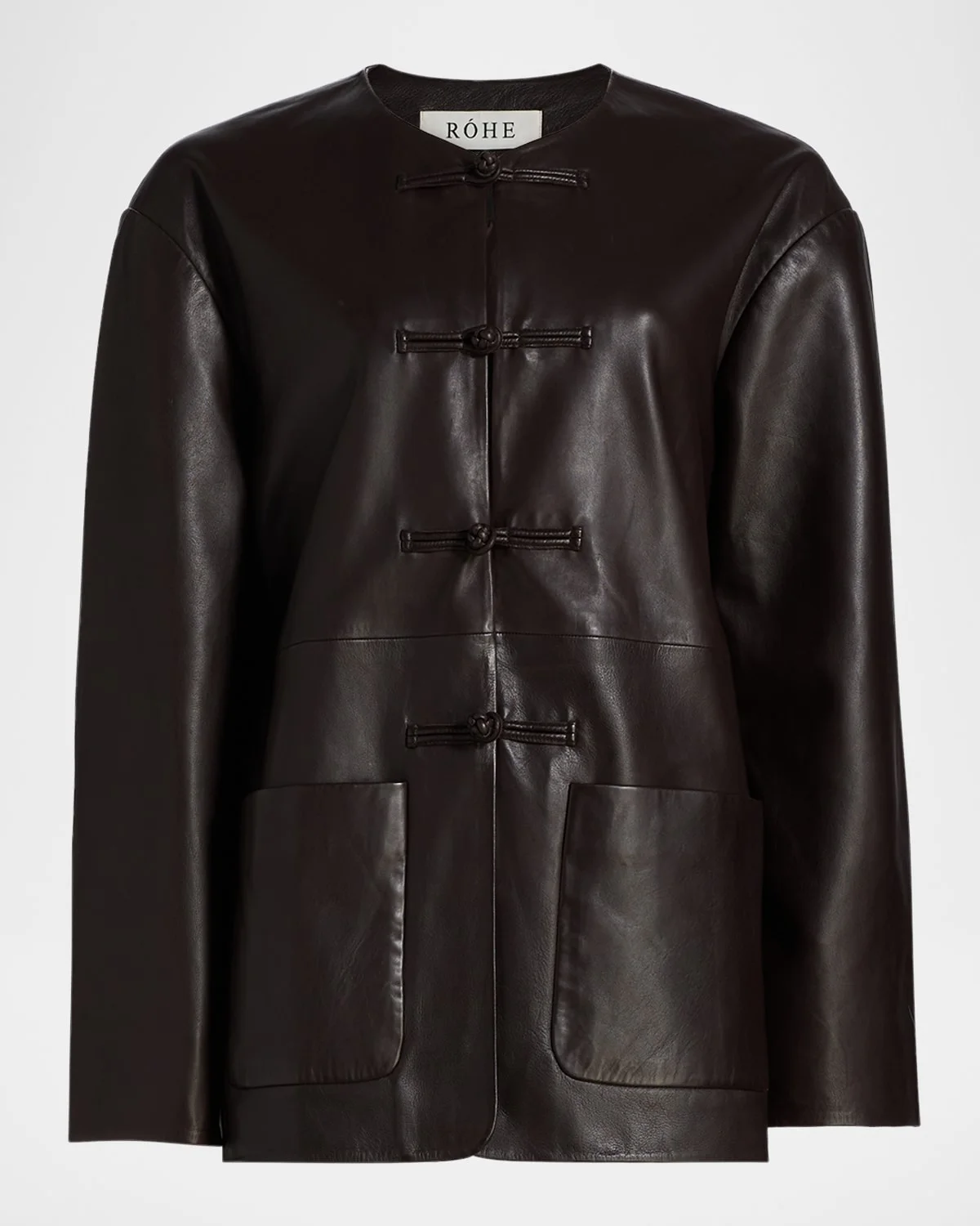 Rohe smooth leather jacket finished with knotted buttons Round neckline Dropped shoulders Long sleeves Patch pockets Relaxed fit Buttonfront Leather Professional cleaning recommended Imported