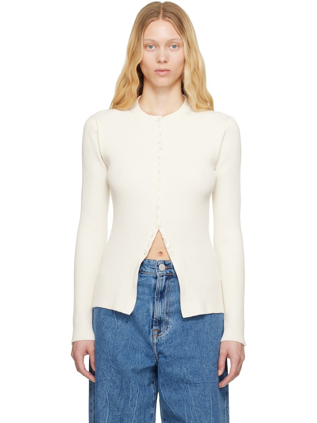 Rib-knit crepe stretch cotton cardigan. · Crewneck · Button closure · Mother-of-pearl hardware Supplier color: Off white 97% cotton, 3% elastane. Made in Italy 251144F095021