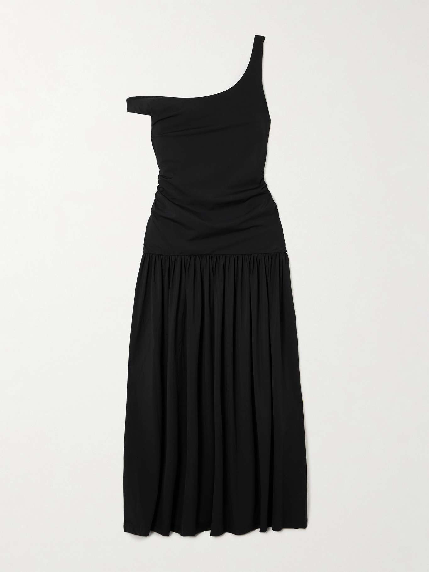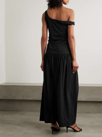 EDITORS'NOTES ROHE's dress is gathered at the dropped waist to create pretty movement and texture through the skirt. It's made from soft stretch-jersey that's ruched through the bodice and has a shoulder-baring, asymmetric neckline. Wear yours with heels or flats. SIZE & FIT Model measurements: - Fits true to size, take your normal size - Designed to be fitted at the bust and waist, loose at the hip - Dropped waist - Mid-weight, stretchy fabric - Model is 177cm/ 5'10" and is wearing a FR 36 - Bust: 77cm/ 30.5" - Waist: 62cm/ 24.5" - Hip: 88cm/ 34.5" DETAILS & CARE - Black stretch-jersey - Slips on - 59% polyamide, 41% elastane - Dry clean