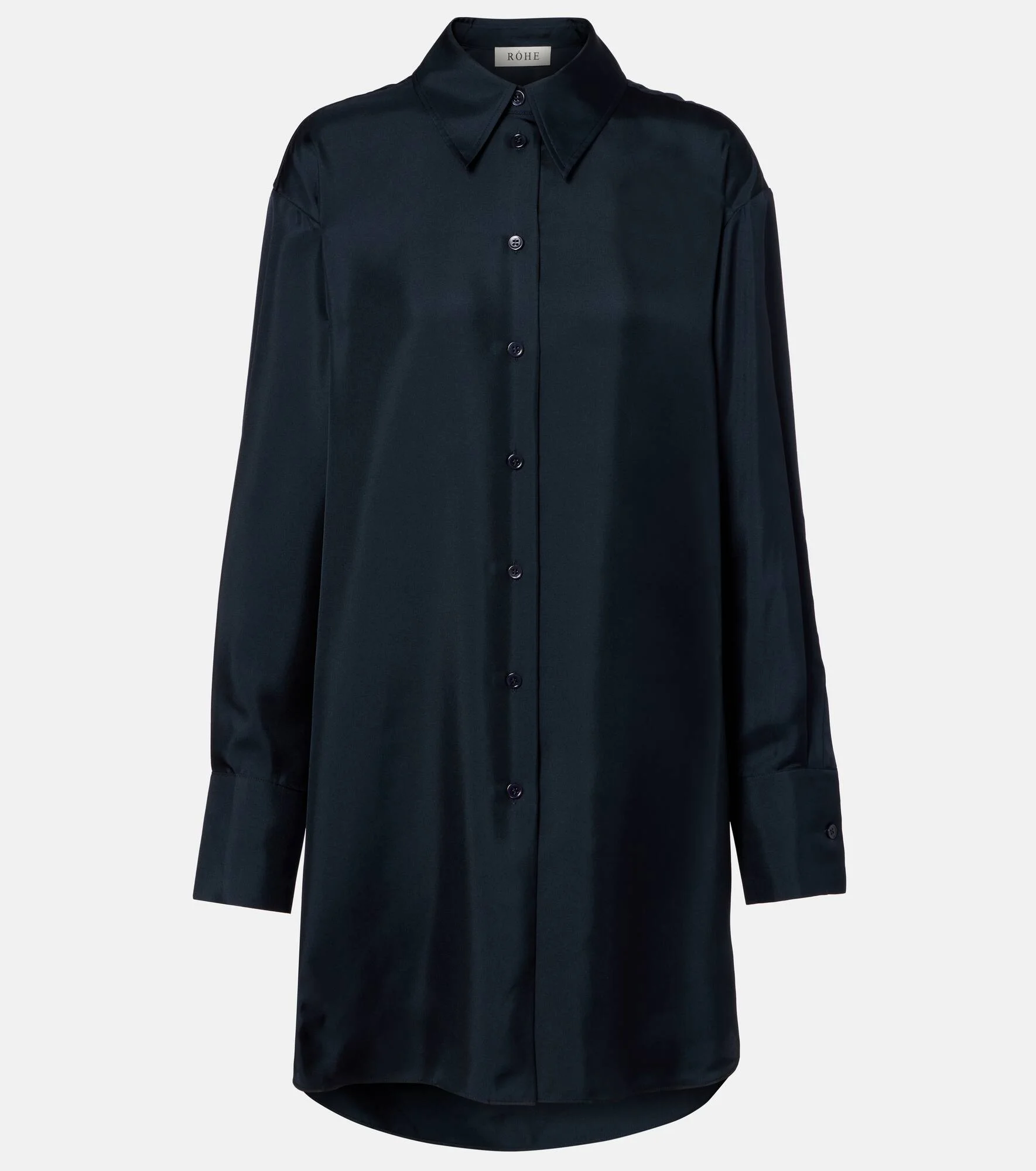 Rohe favors a multifaceted approach to design, infusing every collection with elements of Dutch art and architecture. This classy shirt is crafted from lustrous silk satin and fits oversized, falling to thigh length. Product Details - Material: 100% silk - Care instructions: dry clean - Made in Italy - Designer color name: Storm - Item color: blue - Collar: classic (Straight point) - Cuff: buttoned - Closure: buttoned front - Hem: rounded - Item number: P01103195 Size & Fit - True to size - Dropped shoulders - Designed for a loose fit - Non-stretchy fabric - Falls below the hip - The model seen in the picture is 178cm-5'10" and wearing a size FR 34