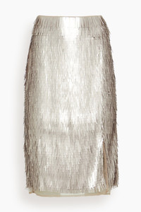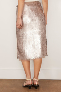 The Rohe Sequin Skirt is a playful addition to your wardrobe. This skirt features allover sequins with a slim silhouette and side slit. Wear yours with a t-shirt and heels. FIT DESCRIPTION MODEL MEASUREMENTS - Fits true to size, take your normal size - Sequin skirt - Knee length - Slim silhouette - High rise - Side slit - 100% polyester - Emma is wearing a size 34/ 2 US - Bust: 32” - Waist: 25” - Hips: 34” - Height: 5’7”
