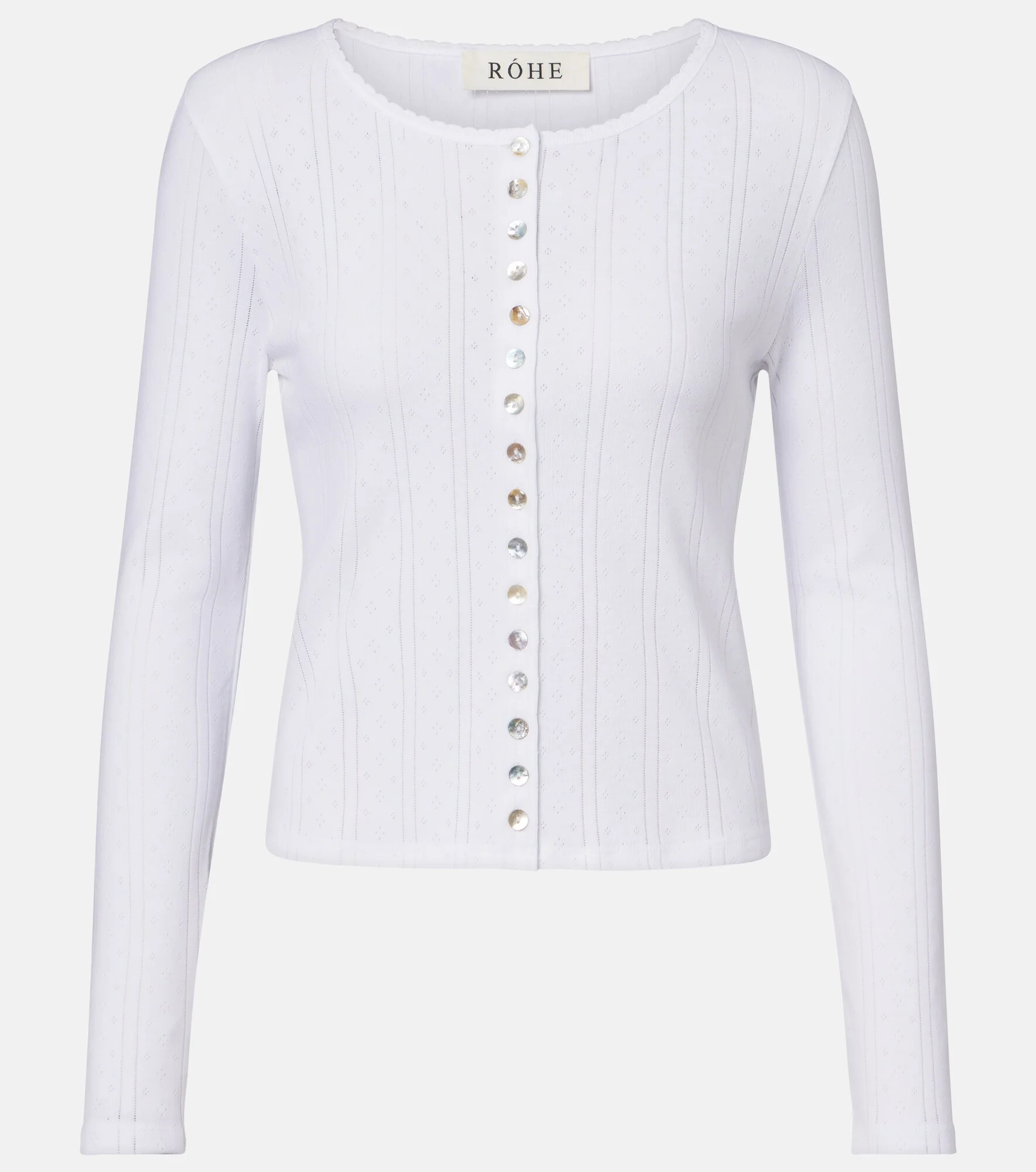 Rohe sets out to create minimalist staples that defy trends and seasons. This cardigan is crafted from cotton with classic, pointelle detailing. Product Details - Material: 100% cotton (organic) - Care instructions: machine wash at 30 degrees - Made in Portugal - Color: white - Designer color name: Off White - Closure: buttoned front - Item number: P01160944 Size & Fit - True to size - Cinched waist - Stretchy fabric - Falls to the hip - The model seen in the picture is 178cm-5'10" and wearing a size FR 34