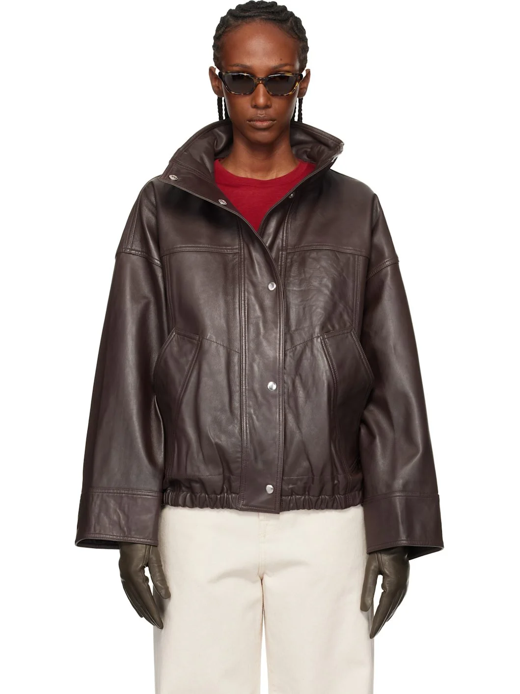 Grained sheepskin jacket. · Funnel neck · Press-stud closure · Welt pockets at waist · Elasticized hem · Dropped shoulders · Full twill lining Supplier color: Earth Body: 100% sheepskin. Lining: 100% polyester. Made in Italy 261144F064005