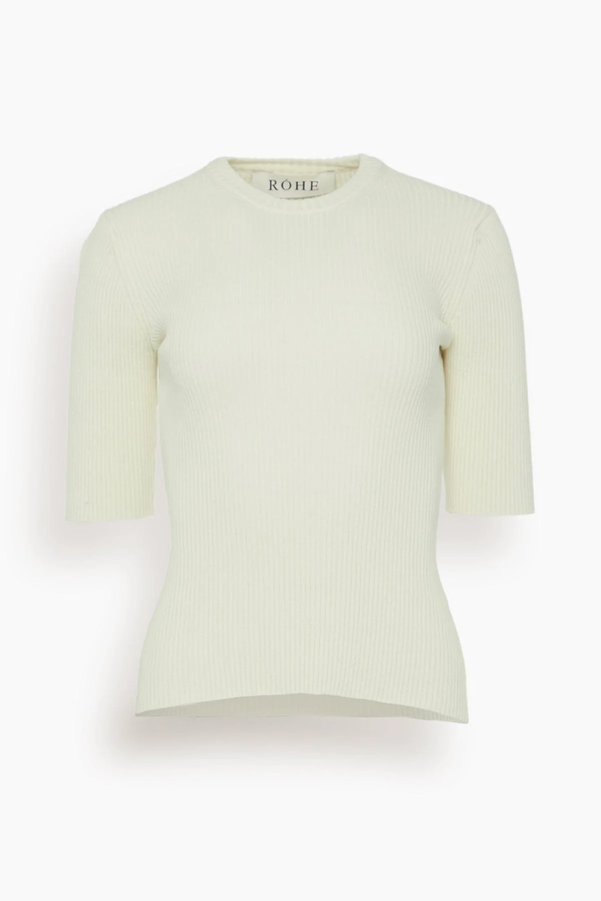 The Rohe Ribbed Knitted Short Sleeve Top is perfect for every day wear. You'll love the relaxed fit and drop sleeves of this superfine wool blend top. Wear yours with the matching trousers and flats. FIT DESCRIPTION MODEL MEASUREMENTS - Fits true to size, take your normal size - Knit top - Relaxed fit - Drop shoulders - Crew neckline - 97% superfine wool, 3% Lycra - Harriet is wearing a size 34/ 2 US - Bust: 32" - Waist: 24" - Hips: 30.5" - Height: 5’8.5”