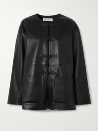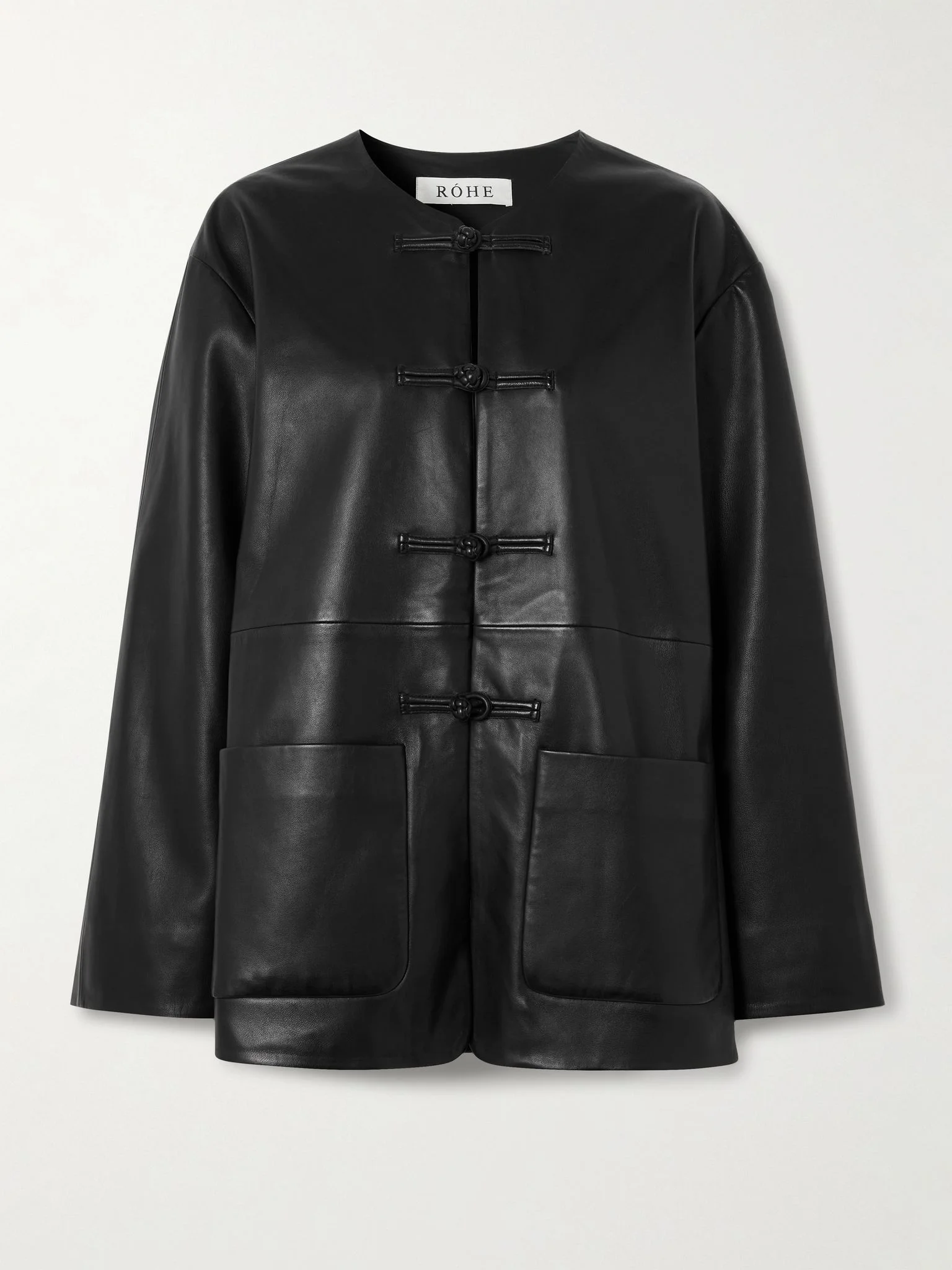 ROHE's jacket fastens with knotted toggles, reminiscent of military styles. It's made from buttery-soft leather with sloped shoulders that emphasise the oversized fit. Size & Fit - Fits true to size, take your normal size - Intended for an oversized fit, cut to be worn very loose - Mid-weight, non-stretchy leather - Model is 177cm/ 5'10" and is wearing a FR 36 Model measurements: - Bust: 77cm/ 30.5" - Waist: 62cm/ 24.5" - Hip: 88cm/ 34.5" Details & Care - Black leather - Toggle fastenings through front - 100% leather (Sheep)