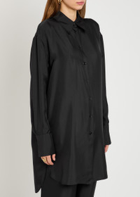 Info & Care ROHE silk shirt; Dropped shoulders, button-fastening cuffs, side splits at curved hem, longer back hem Button fastenings through front; 100% silk; Dry clean; Size & Fit Length shoulder to hem: 34 inches/ 86.5cm; back: 36 inches/ 91.5cm Midweight; Designed to be worn oversized, cut for loose fit Model is 5'9"/ 175cm and wears a size FR36