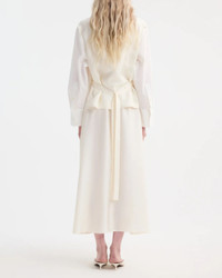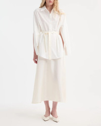 The Poplin Silk Combined Gilet-Dress in Cotton and Silk in the color Optic White by Rohe is a deconstructed gilet-dress, with layered cotton shirting and a fluid silk skirt that features open armholes and a buttoned wrap belt to invite styling freedom. Your perfect neutral fall staple dress. - Material: Top 100% cotton, Skirt 100% silk - Details: Normal Fit. - Fit: The model is 179cm and is wearing a size 4 (FR 36). - Style it with: An oversized bag and flat.